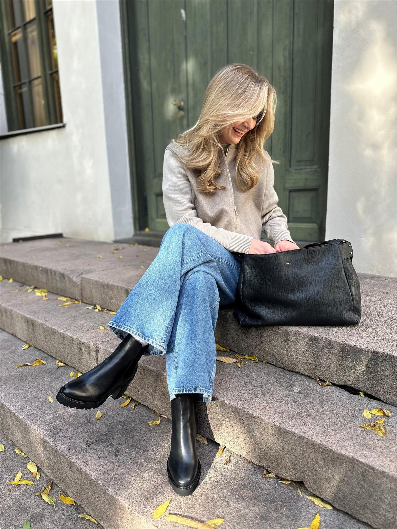 Elegant og funksjonell skulderveske i mykt, strukturert kalveskinn. Den brede, justerbare skulderremmen gir god bærekomfort, mens den romslige innsiden har glidelåslomme og åpne lommer for praktisk organisering av hverdagsnødvendigheter. Vesken lukkes med glidelås på toppen for ekstra sikkerhet.