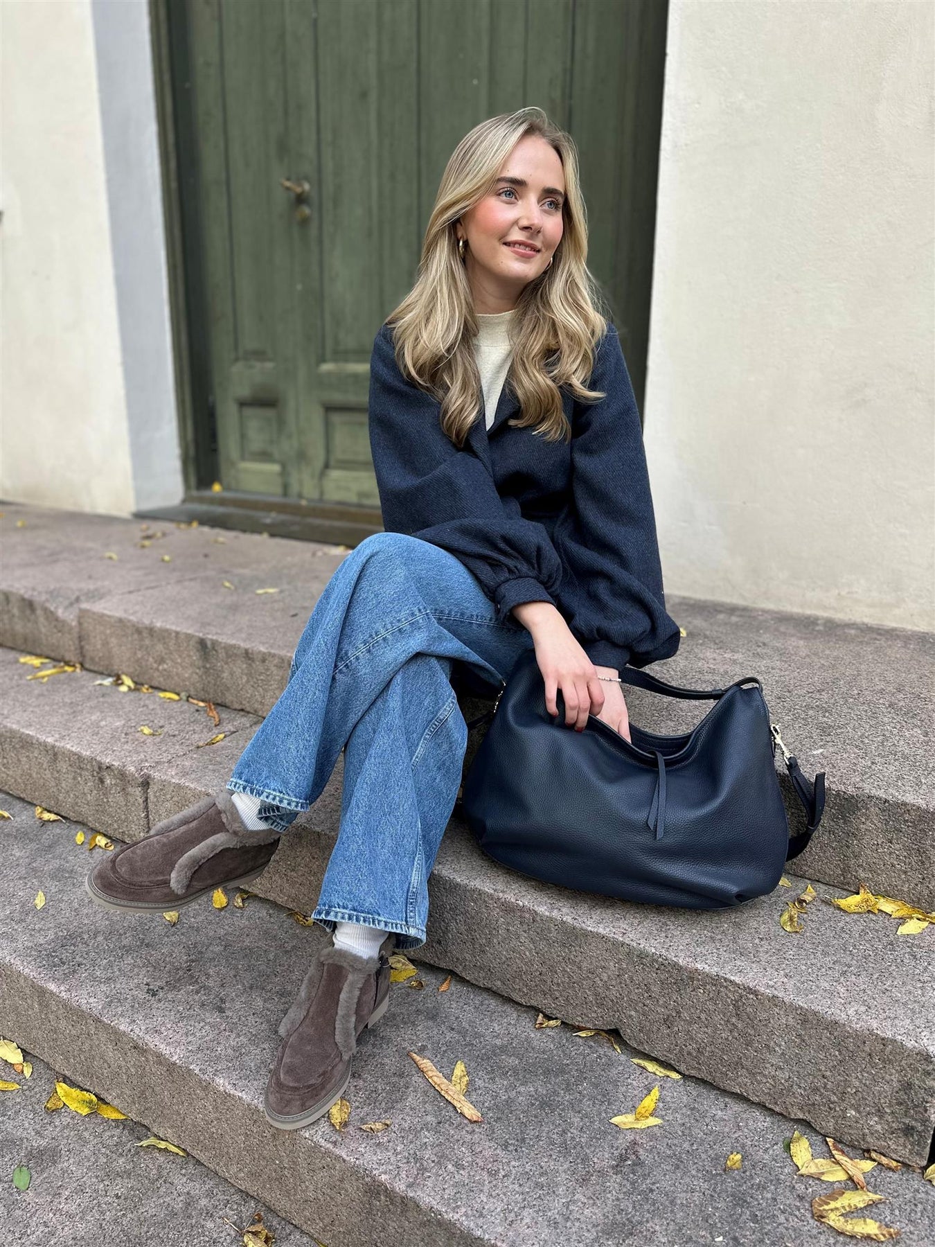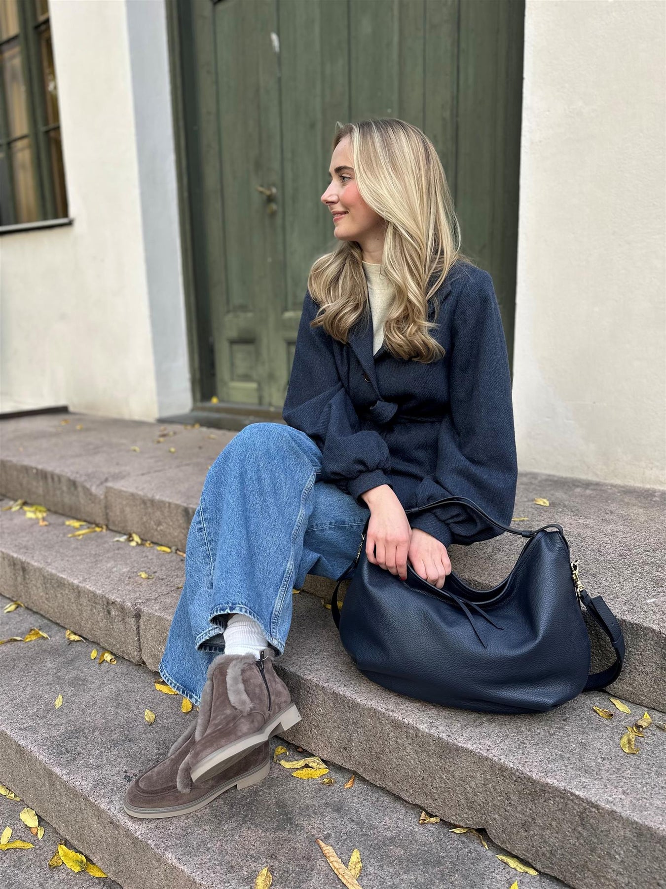 Elegant og anvendelig skulderveske i mykt, strukturert kalveskinn. Den avrundede formen gir vesken et moderne uttrykk, mens den justerbare skulderremmen gjør den behagelig å bære både til jobb og fritid. Innsiden er romslig med praktiske lommer for mobil, nøkler og småting, og lukkes sikkert med glidelås.