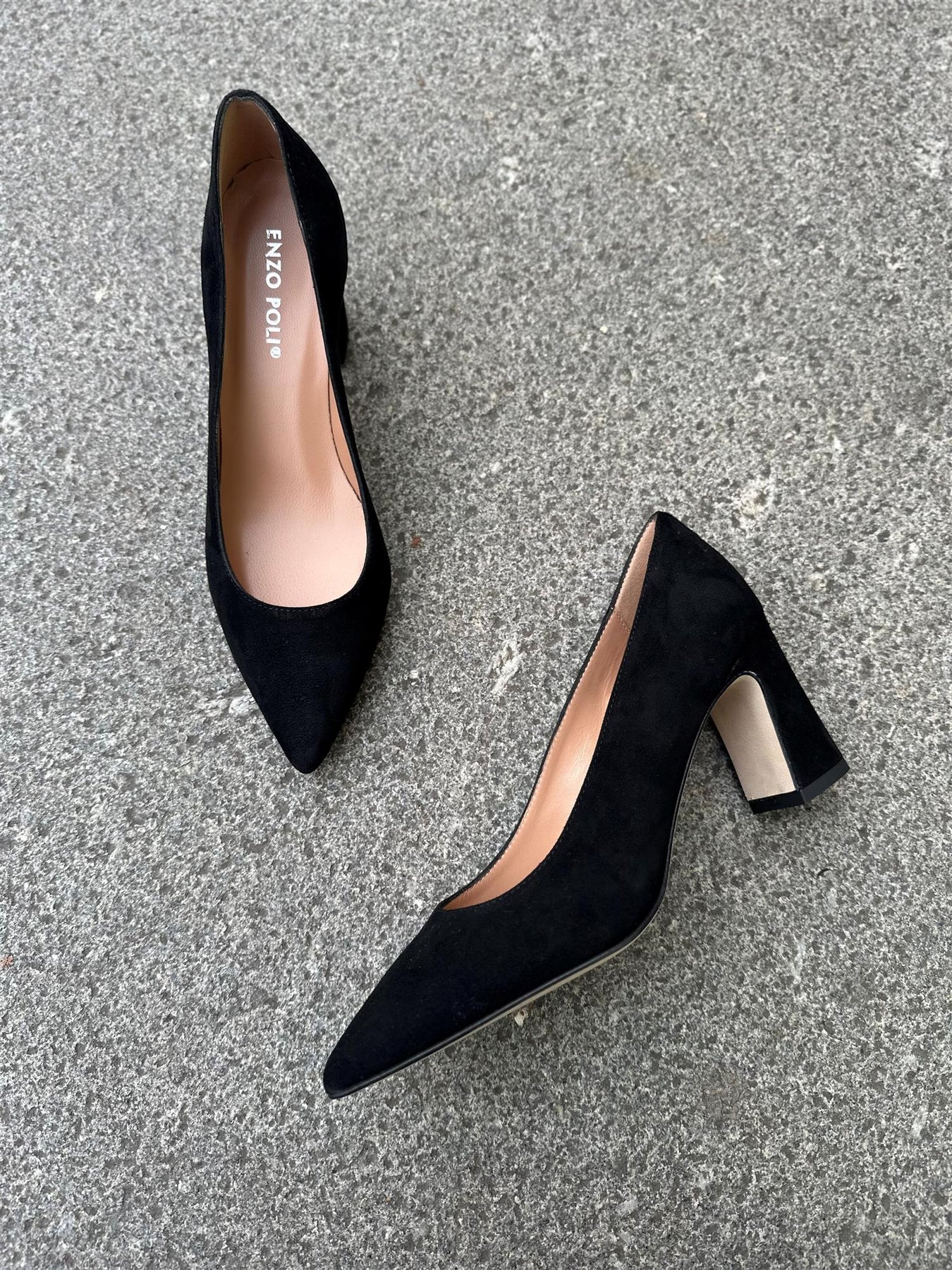 Elegant pumps i sort semsket kalveskinn med moderne hæl og spiss tå. Dette er en favoritt hos oss! Den stabile blokkhælen gir både høyde og komfort, mens den myke skinnforede innersålen gjør modellen behagelig å bruke gjennom hele dagen. En tidløs sko som passer like godt til jobbantrekket som til kjolen på kvelden.
