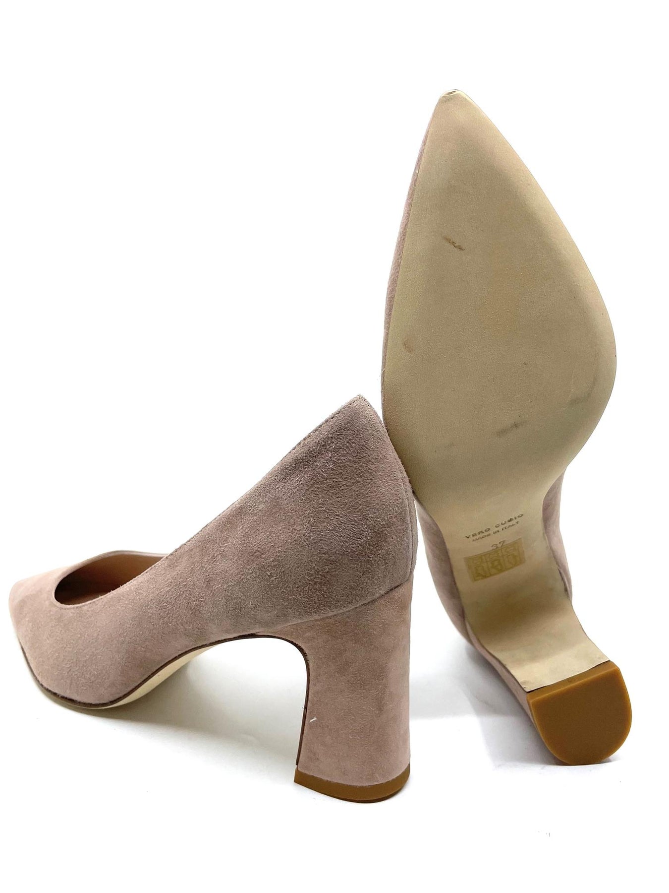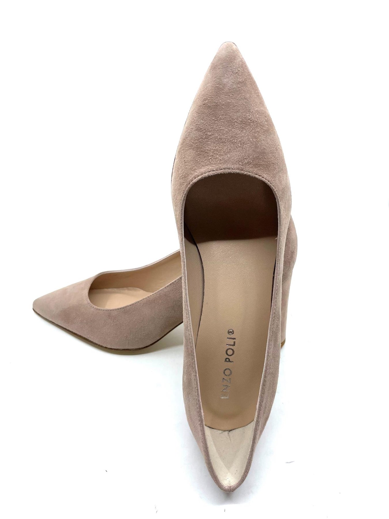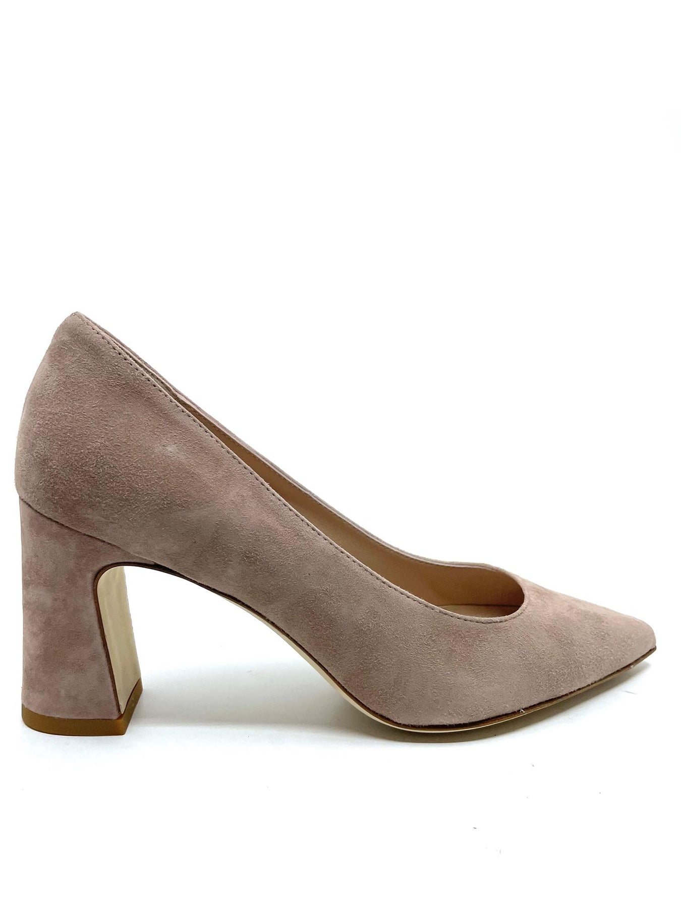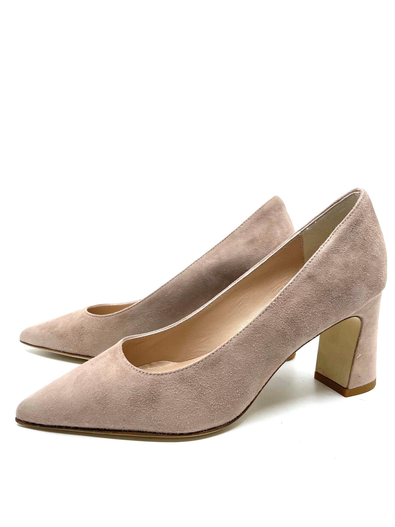 Elegant pumps i semsket kalveskinn med moderne hæl og spiss tå. Dette er en favoritt hos oss! Den stabile blokkhælen gir både høyde og komfort, mens den myke skinnforede innersålen gjør modellen behagelig å bruke gjennom hele dagen. En tidløs sko som passer like godt til jobbantrekket som til kjolen på kvelden.