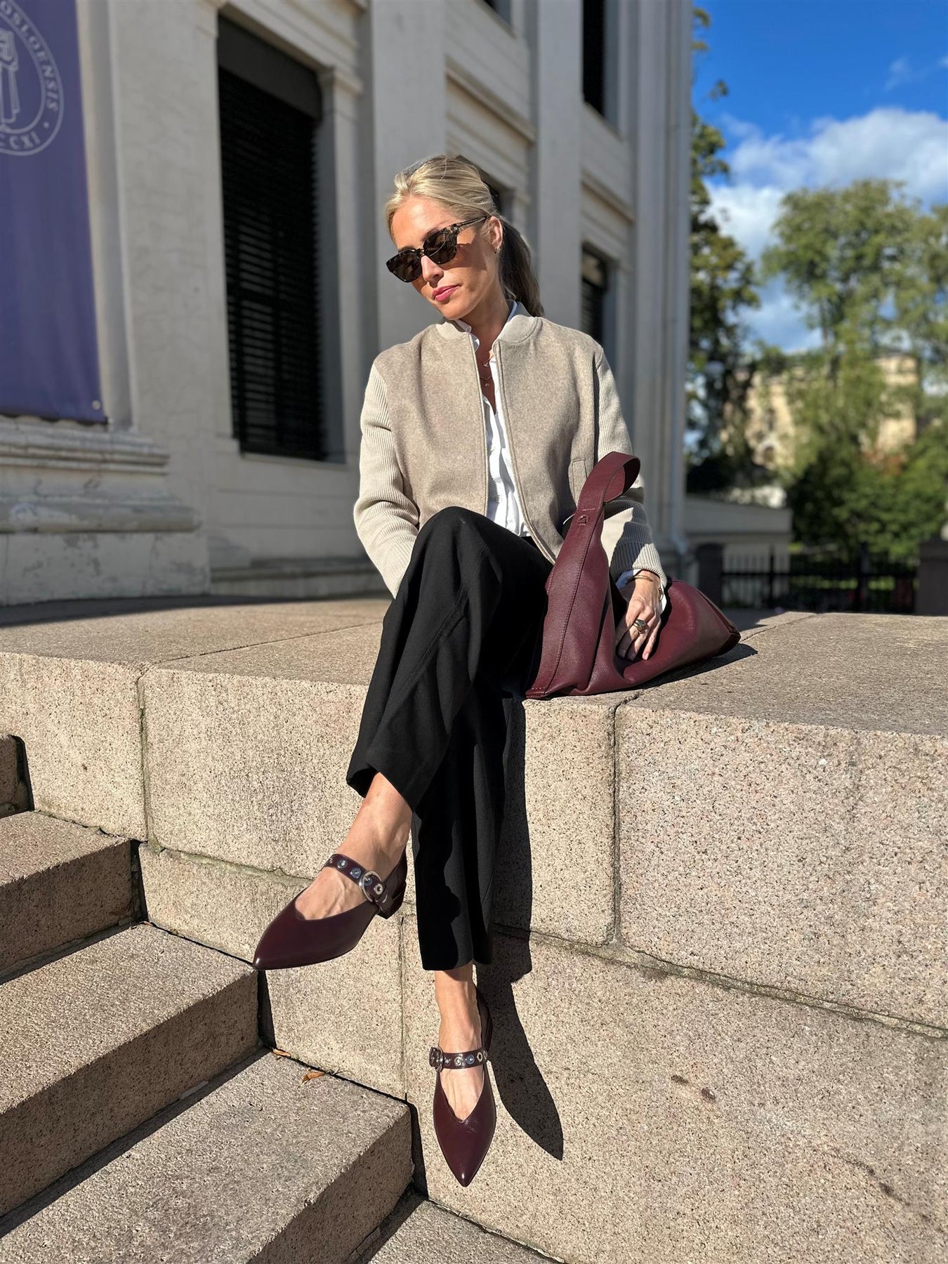 Elegant og særpreget sko i mørk burgunder kalveskinn. Den spisse tåen gir et feminint og sofistikert uttrykk, mens den brede remmen med sølvfargede detaljer tilfører et moderne og edgy preg. Den lave hælen gjør skoen komfortabel til hverdags, samtidig som den passer perfekt til penere anledninger.