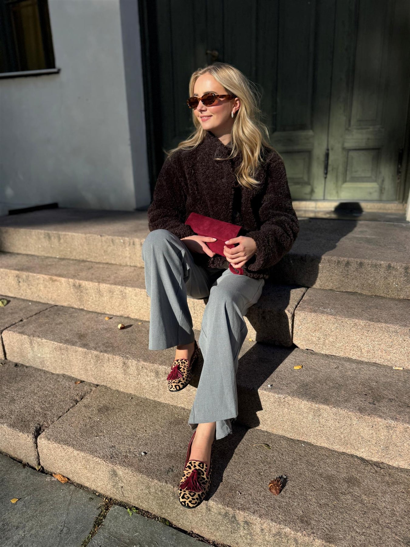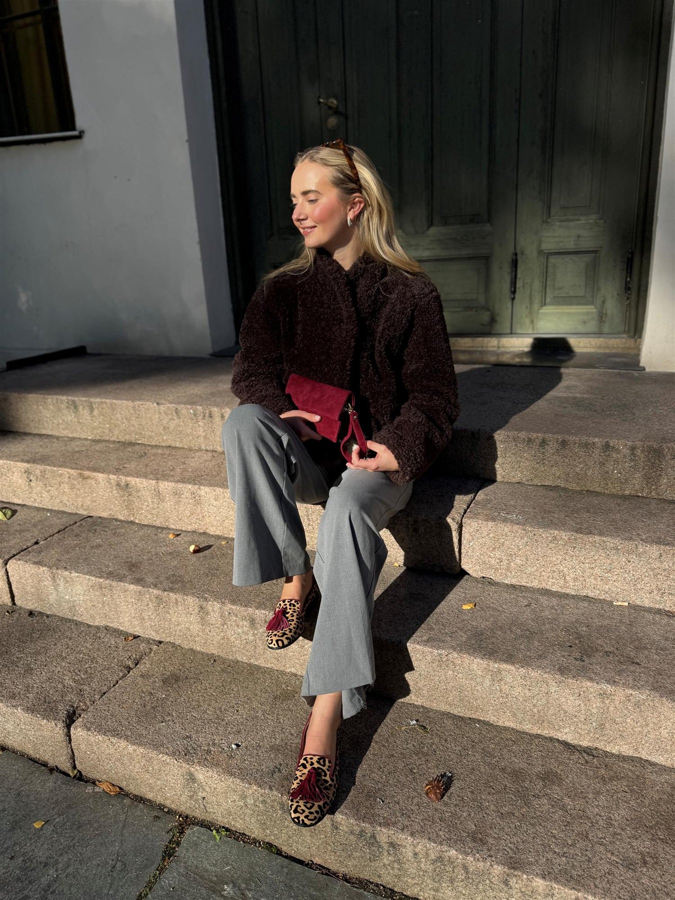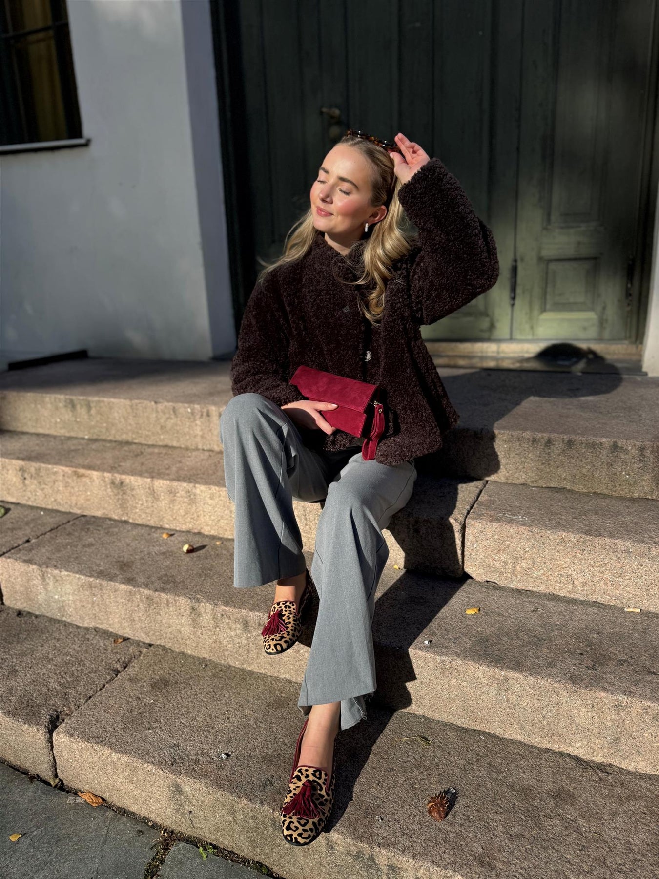 En leken og iøynefallende loafer i semsket kalveskinn med leopardmønster. De vinrøde frynsene og detaljene langs åpningen gir skoen en elegant kontrast og gjør den til et spennende blikkfang. Perfekt både til å friske opp hverdagsantrekket og som et statement-piece til penere anledninger.