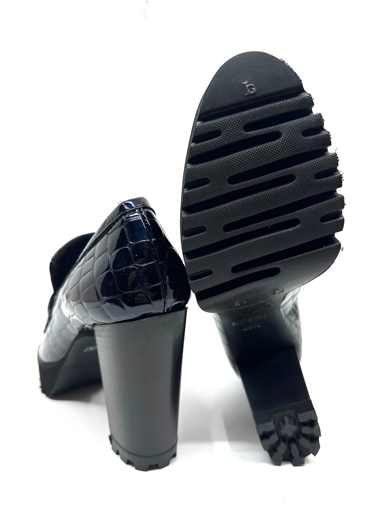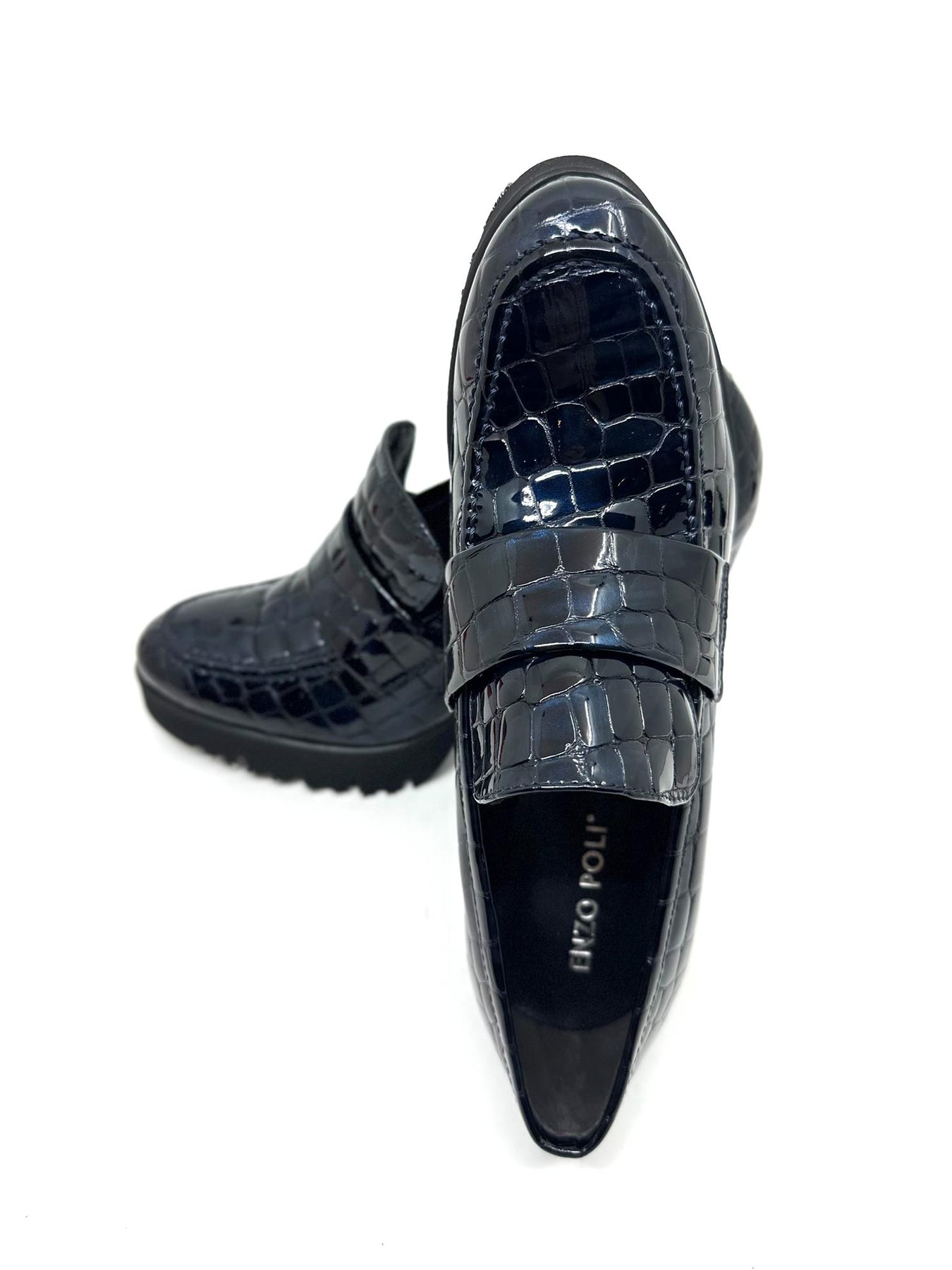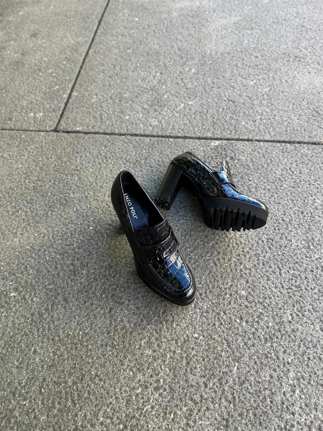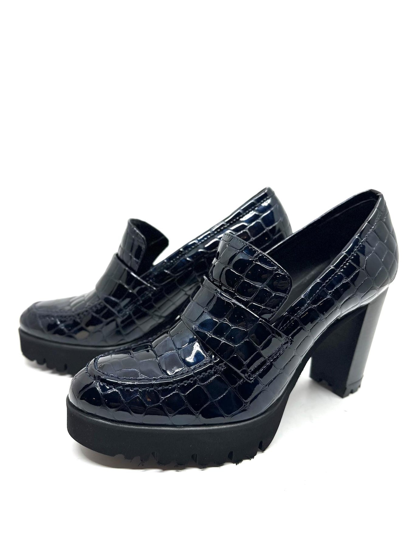 Denne eksklusive byskoen kombinerer klassisk eleganse med et moderne uttrykk. Den markante blokkhælen gir både høyde og stabilitet, mens den kraftige gummisålen sørger for godt grep og komfort gjennom hele dagen. Det krokopregede skinnet tilfører en luksuriøs finish som gjør skoen til et blikkfang – perfekt både til kontoret og kveldsanledninger.