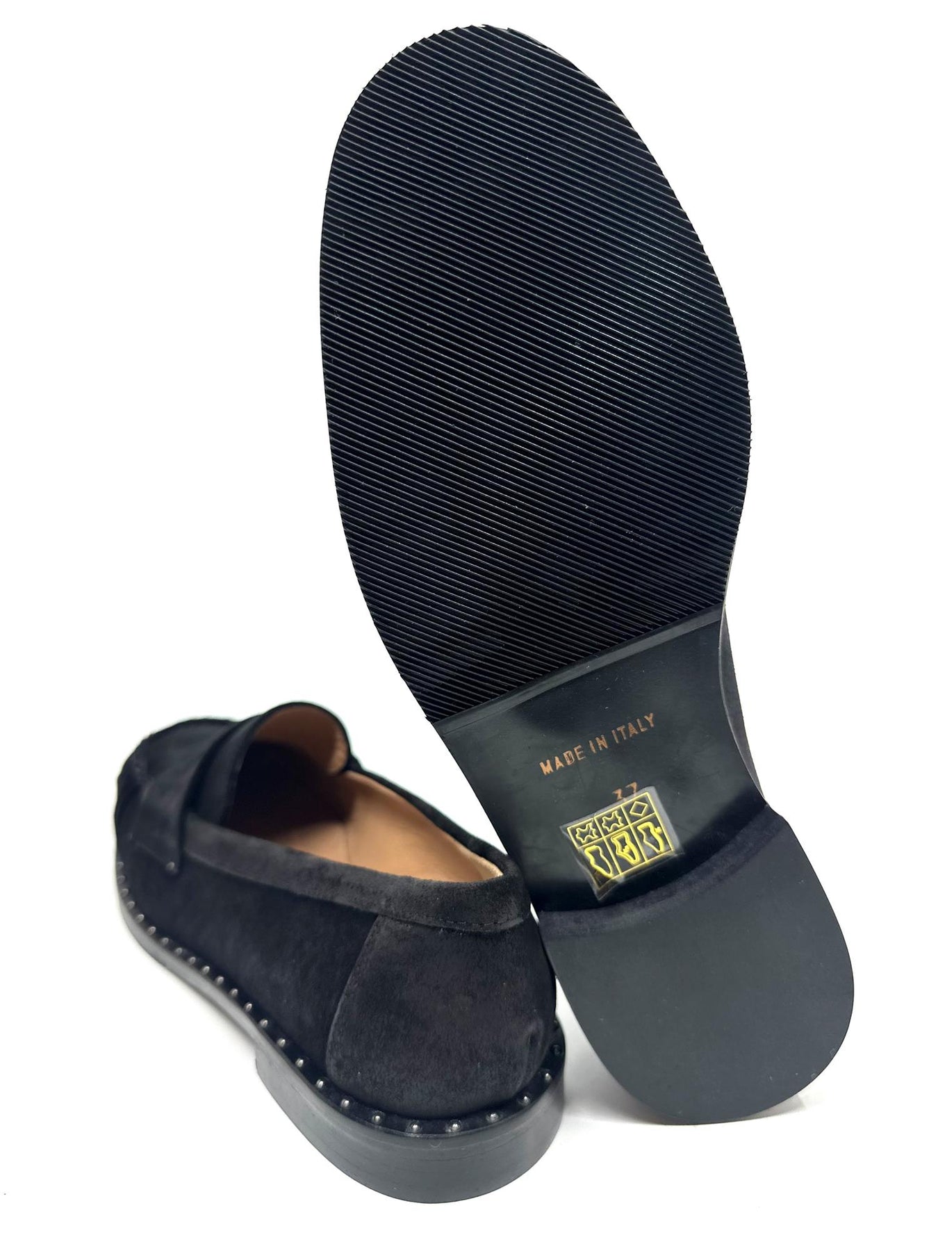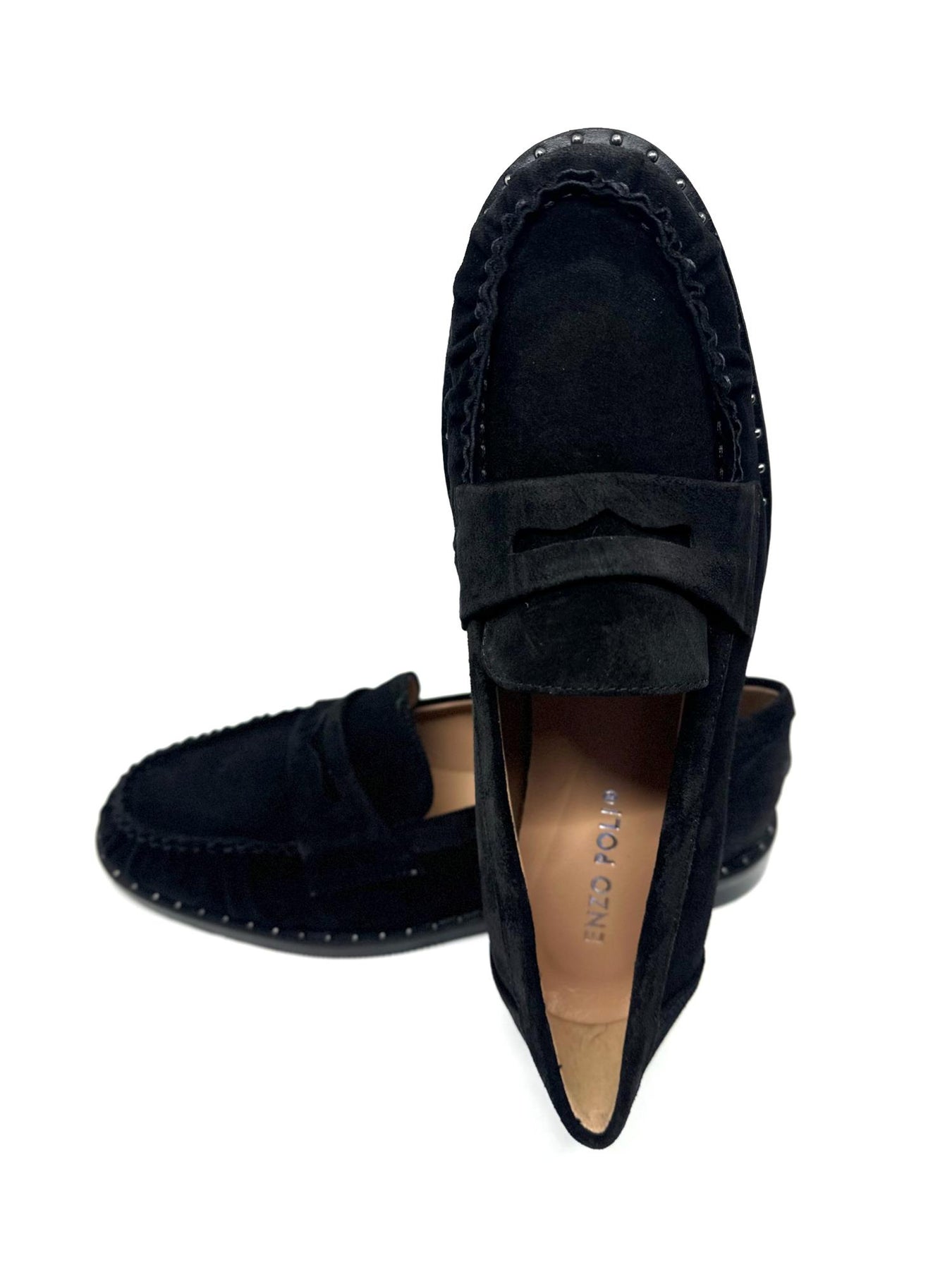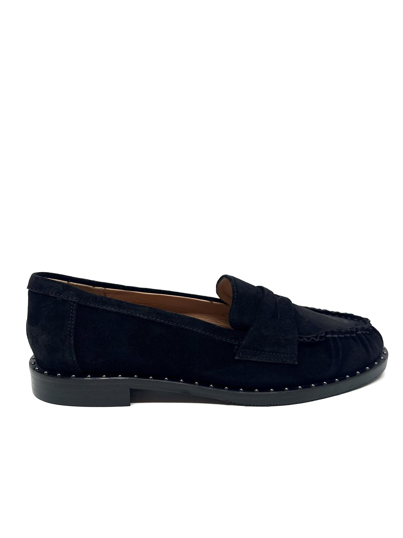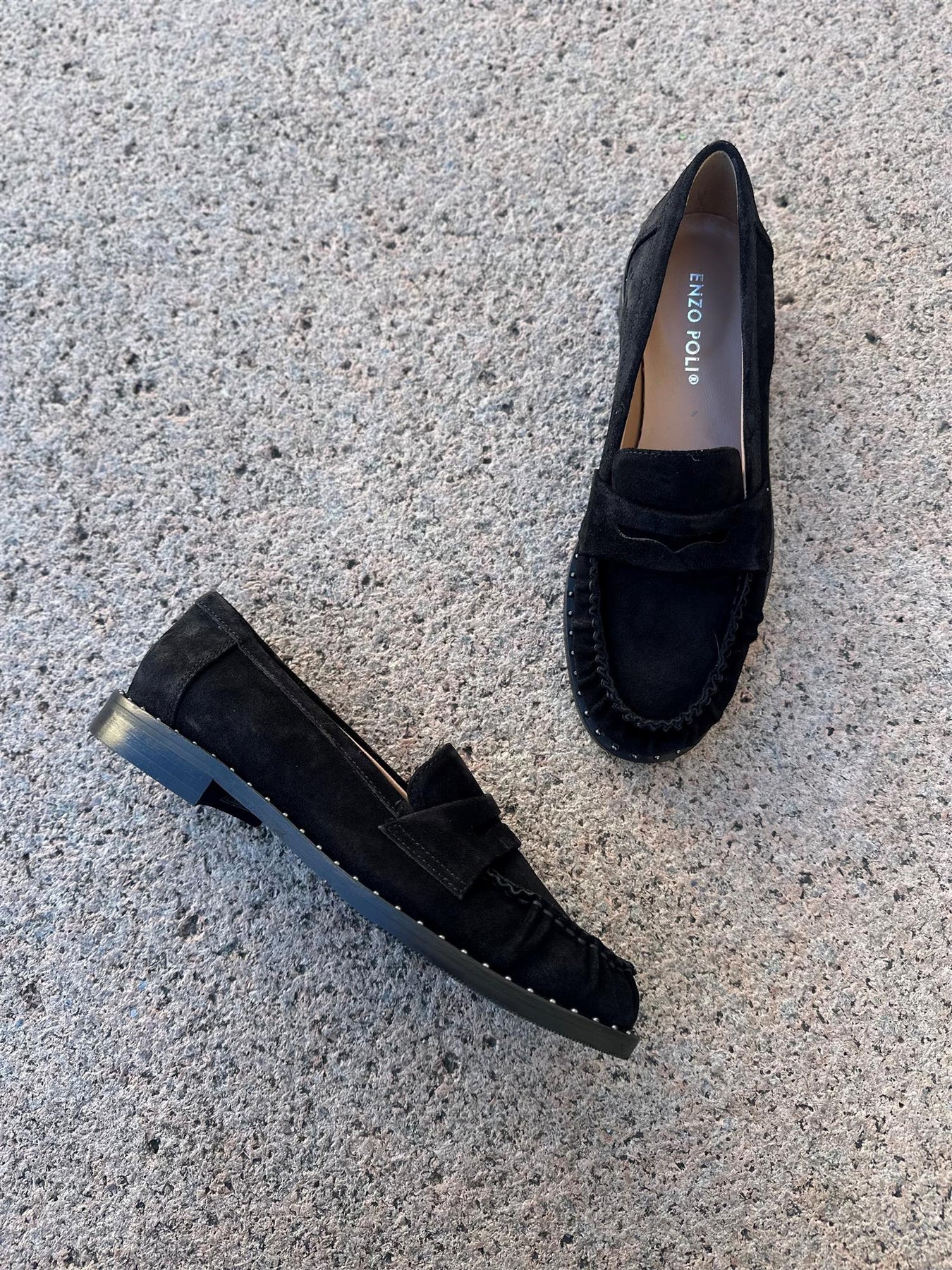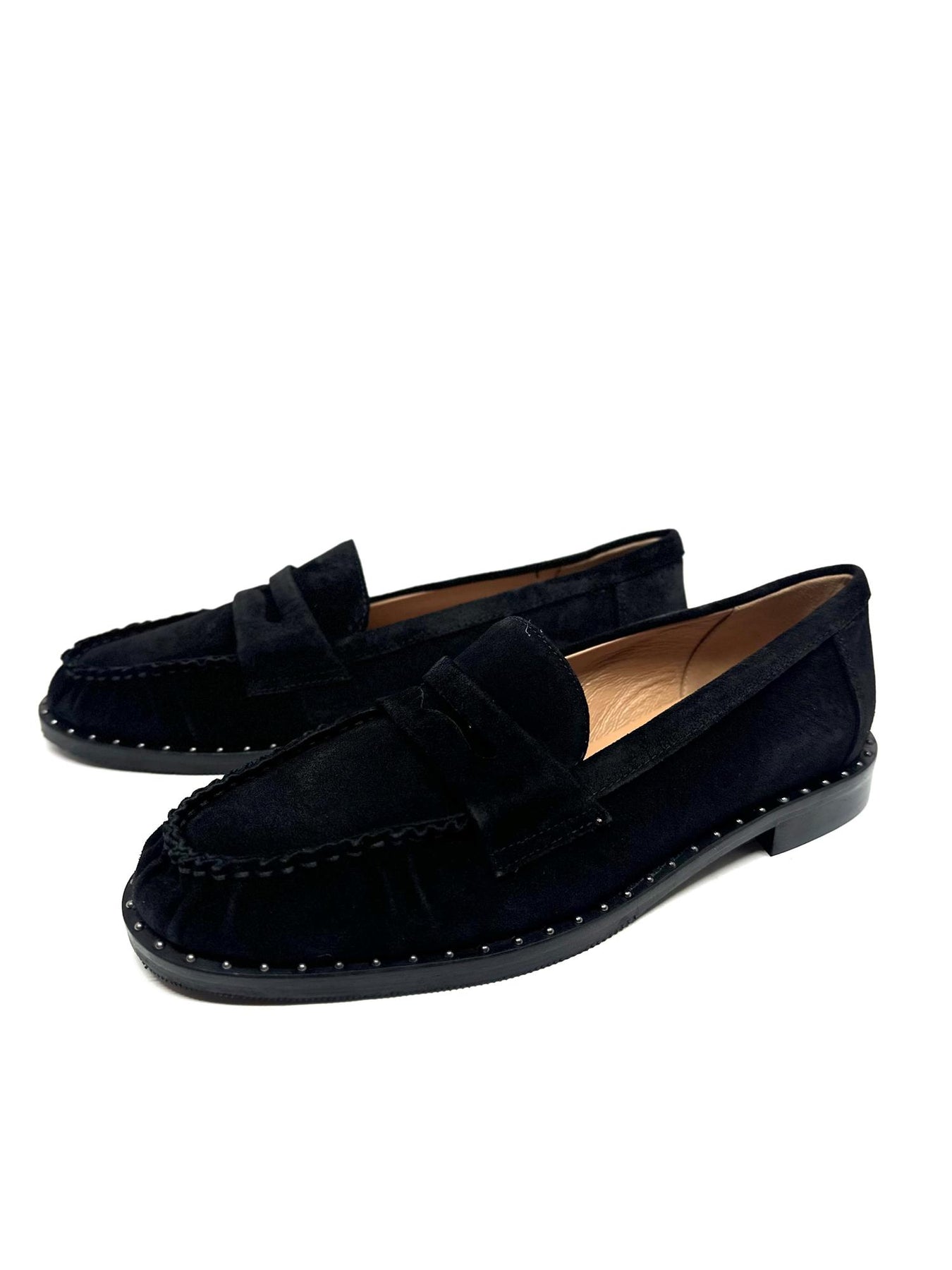 En moderne loafer i sort semsket kalveskinn – klassisk, men med en edgy vri. Modellen har dekorativ rynkekant foran og små metallstuds hele veien rundt sålekanten, som gir skoen et unikt uttrykk. Den myke semskede overflaten møter en fleksibel gummisåle som gjør skoen behagelig til hverdagsbruk. Perfekt til både jeans, skjørt og dressede antrekk når du vil ha en tidløs sko med litt ekstra detalj.
