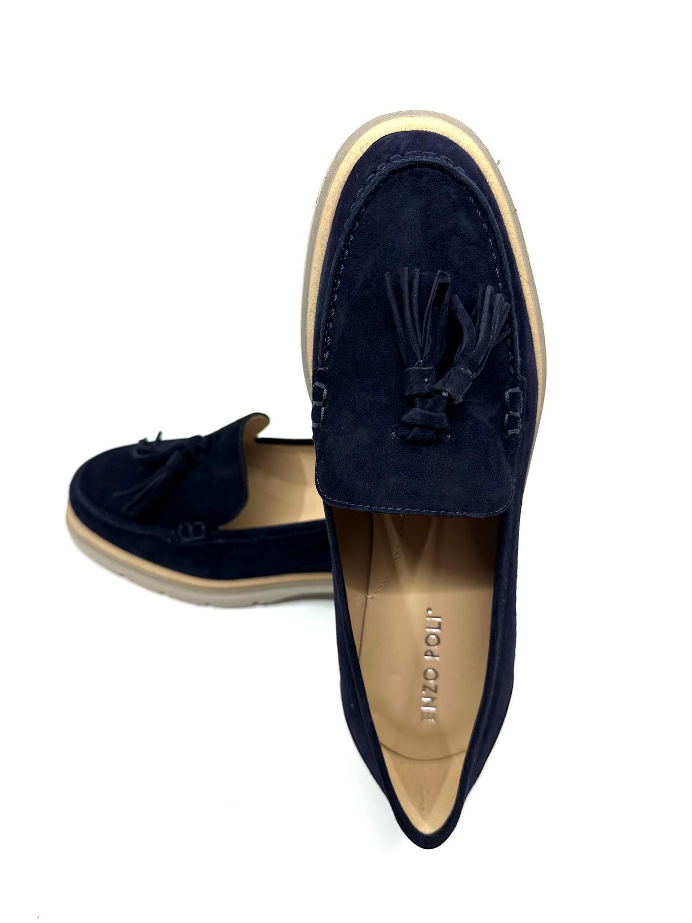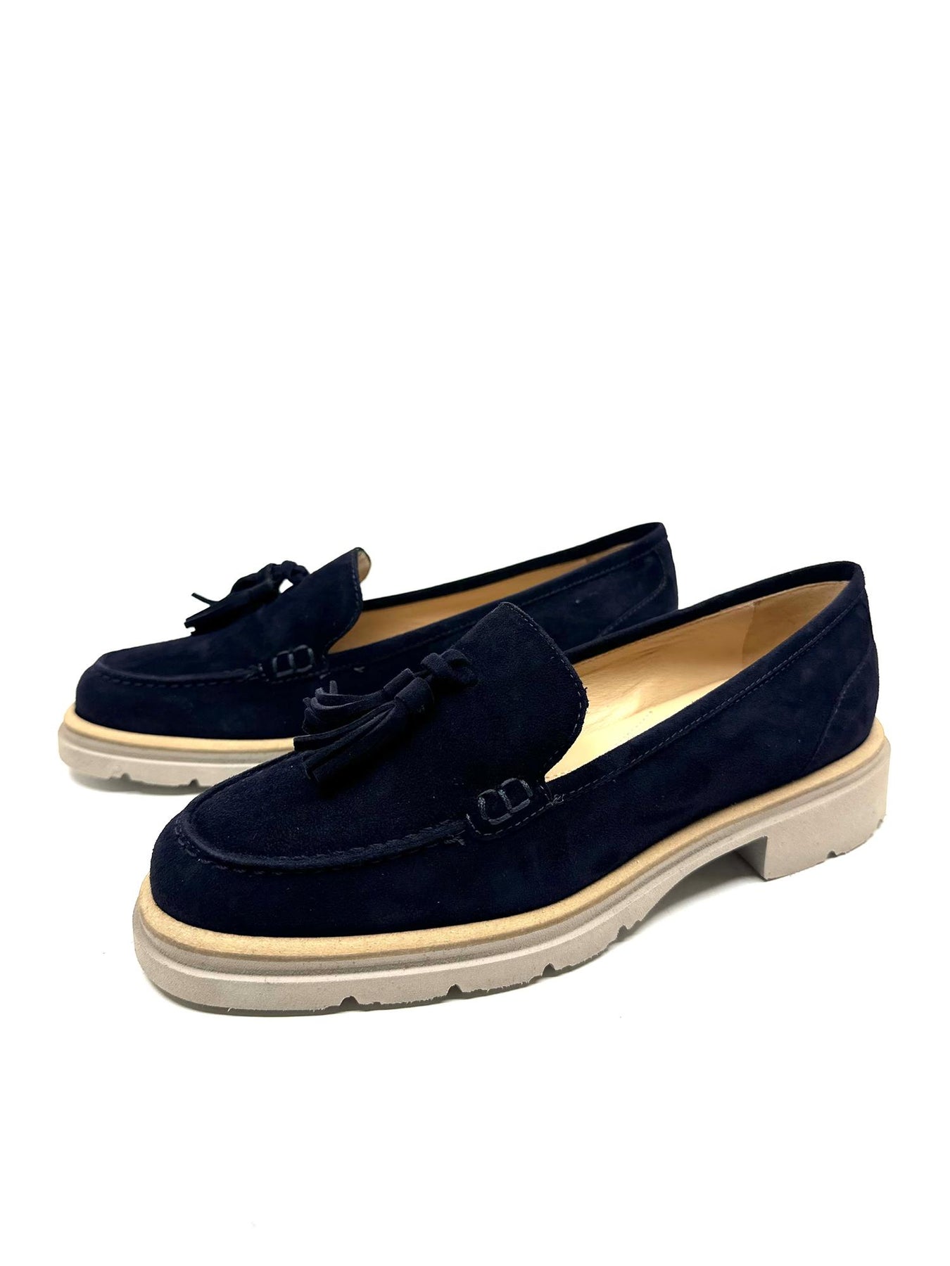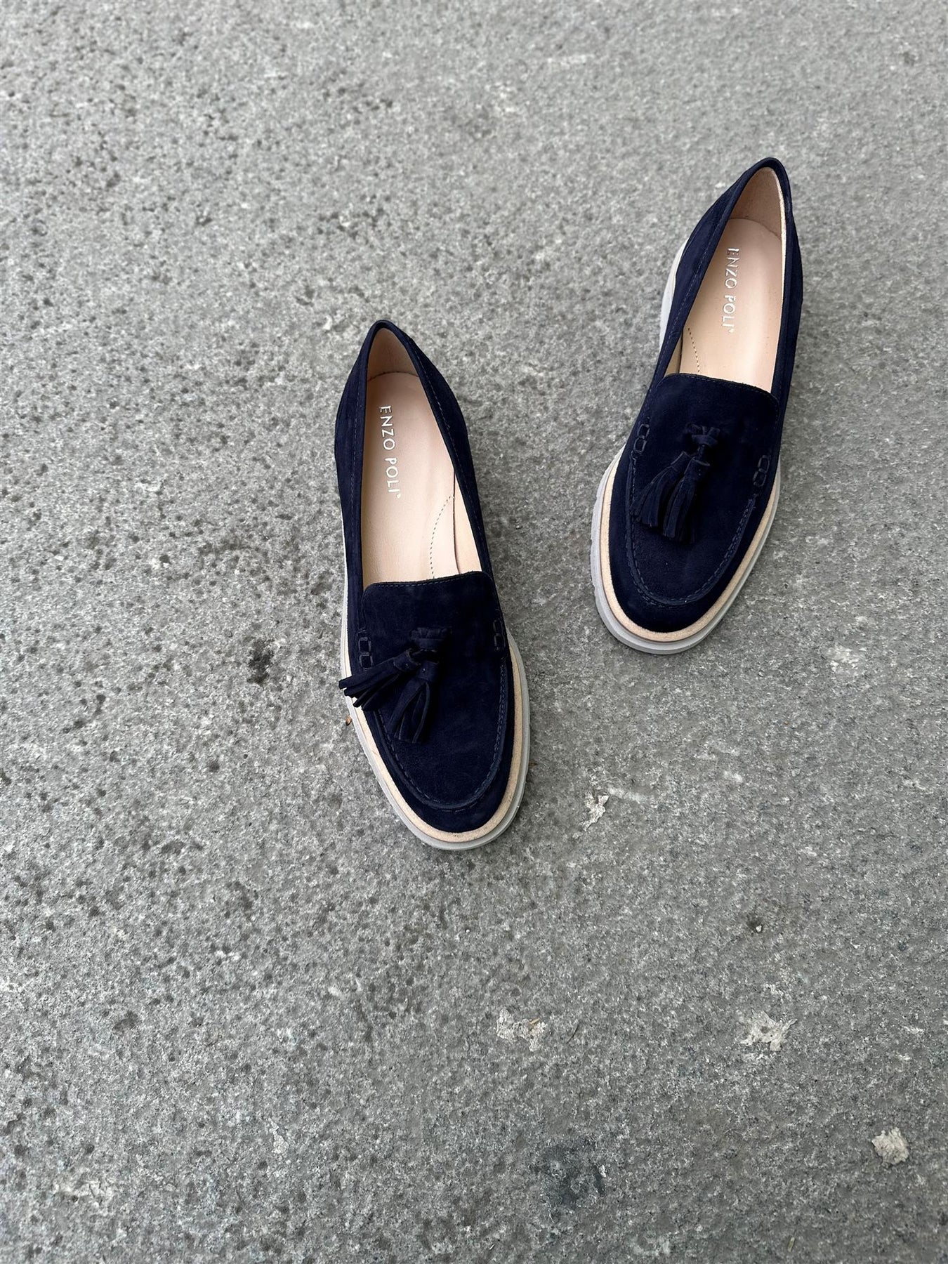 Denne loaferen er laget i mykt semsket kalveskinn og har et tidløst uttrykk med dekorative frynser. Den lave hælen og den stabile sålen gjør skoen behagelig å bruke gjennom dagen, mens den rene silhuetten gjør den enkel å kombinere med ulike antrekk. En loafer som passer like godt til hverdags som til litt penere bruk.