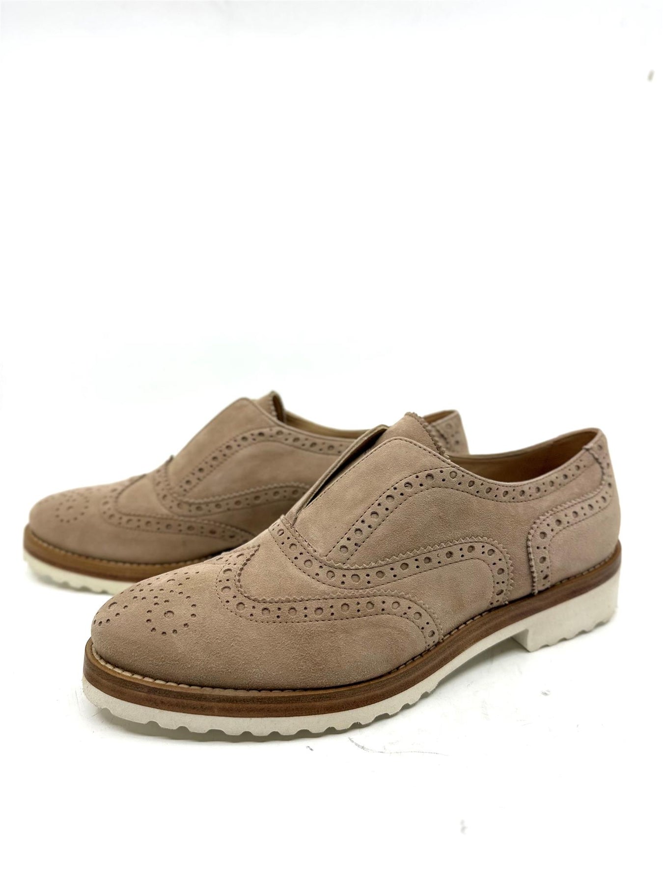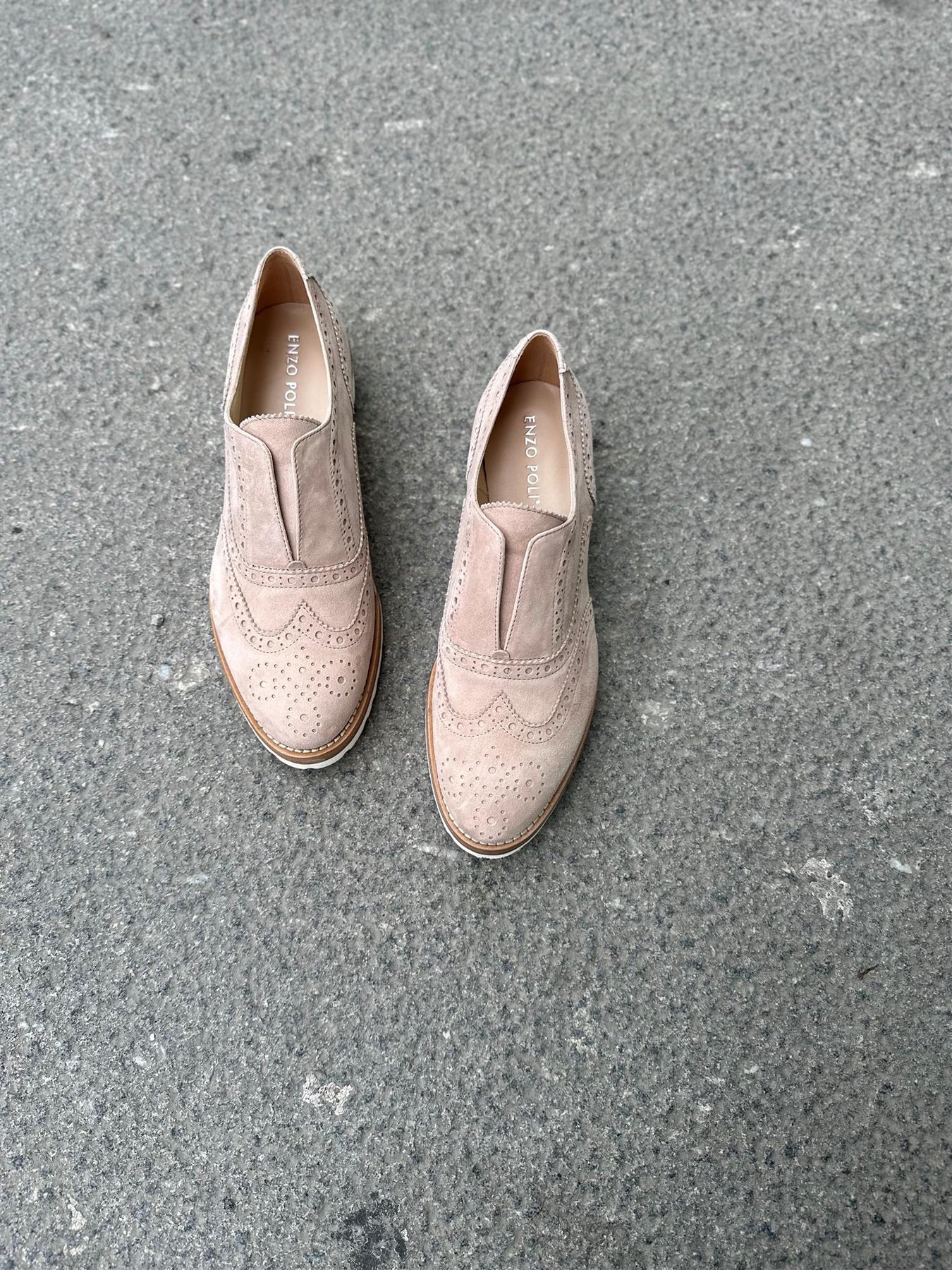Slip-on i semsket kalveskinn med brogue-detaljer