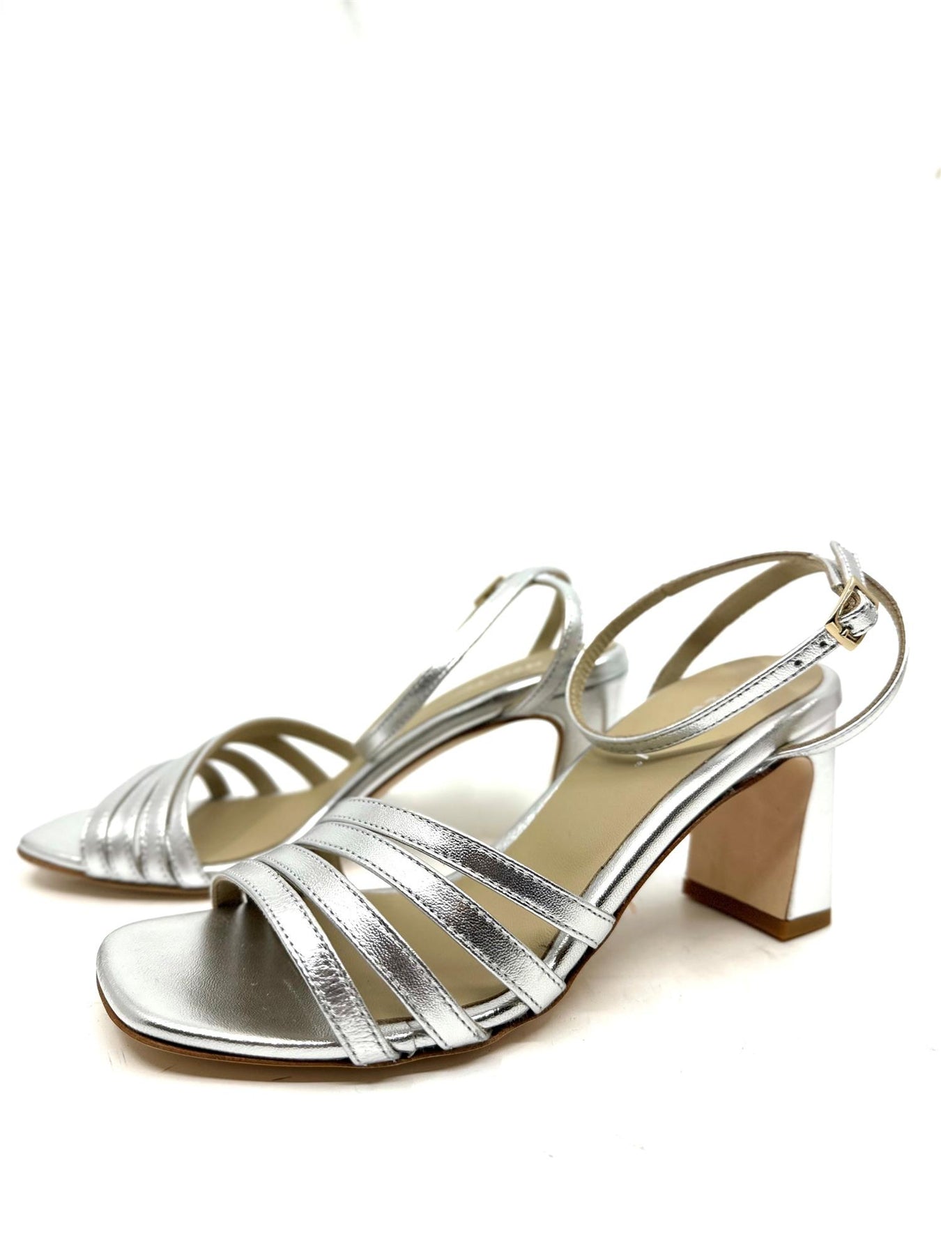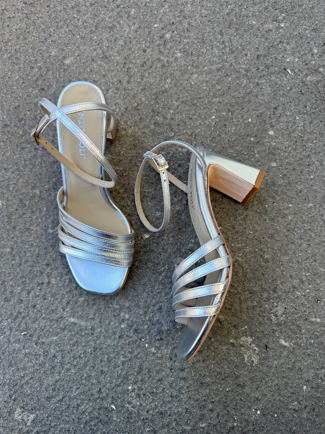 En nydelig sølvsandal i mykt skinn med smale remmer foran og justerbar stropp rundt ankelen. Remmene legger seg fint over foten og gjør at skoen sitter pent og stabilt.