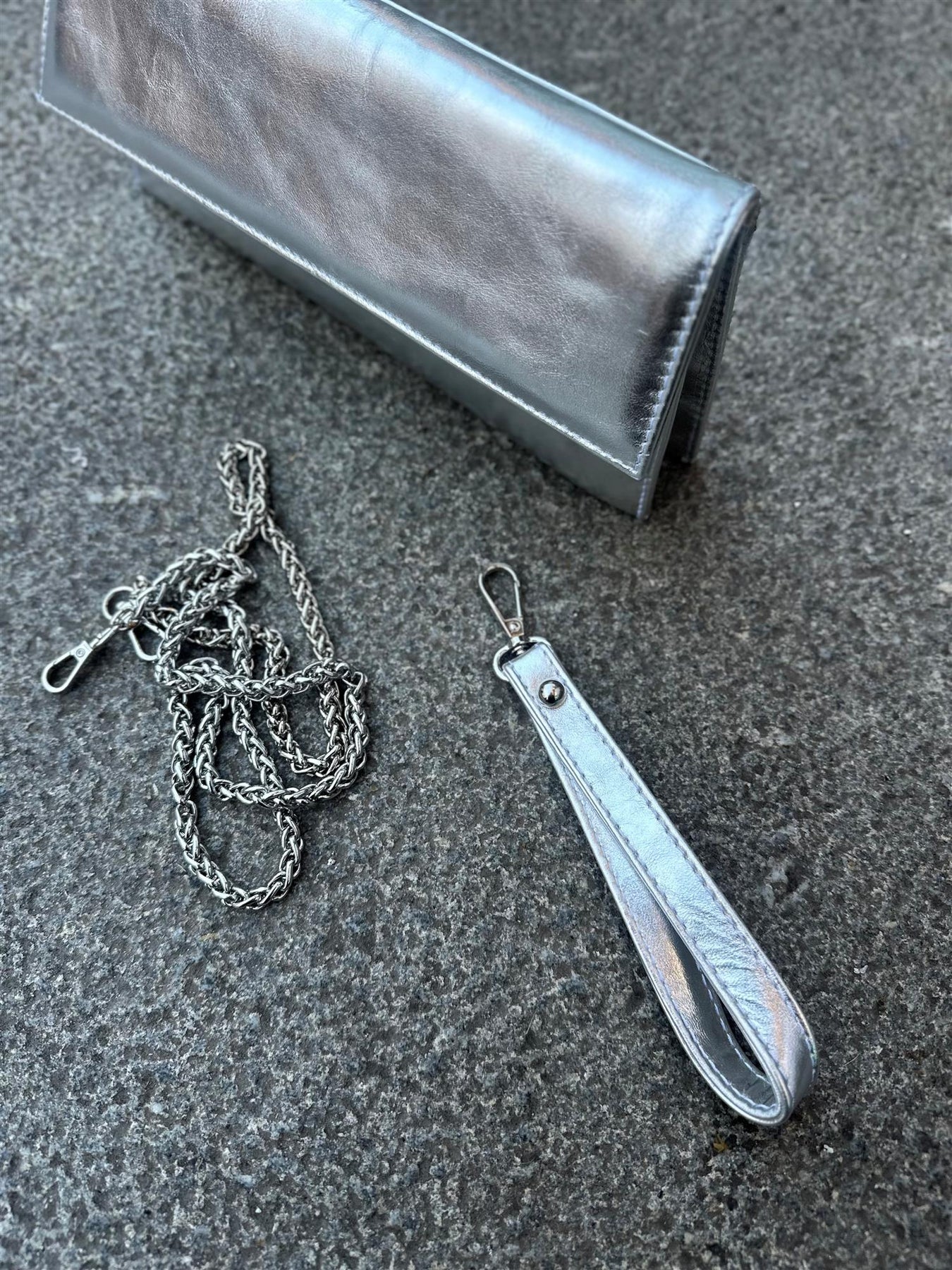 Detaljer: vesken lukkes ved hjelp av en magnet. Det følger med en avtakbar lenke sølvfarget metall.