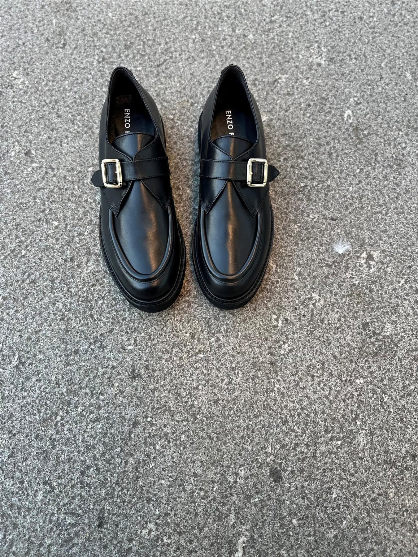 Disse sorte loafersene er laget i lakkert kalveskinn og har en klassisk spenne i gullfarget metall. Den avrundede tåen og solide sålen gir både et tidløst uttrykk og komfort. Passer godt til både formelle og hverdagslige antrekk.