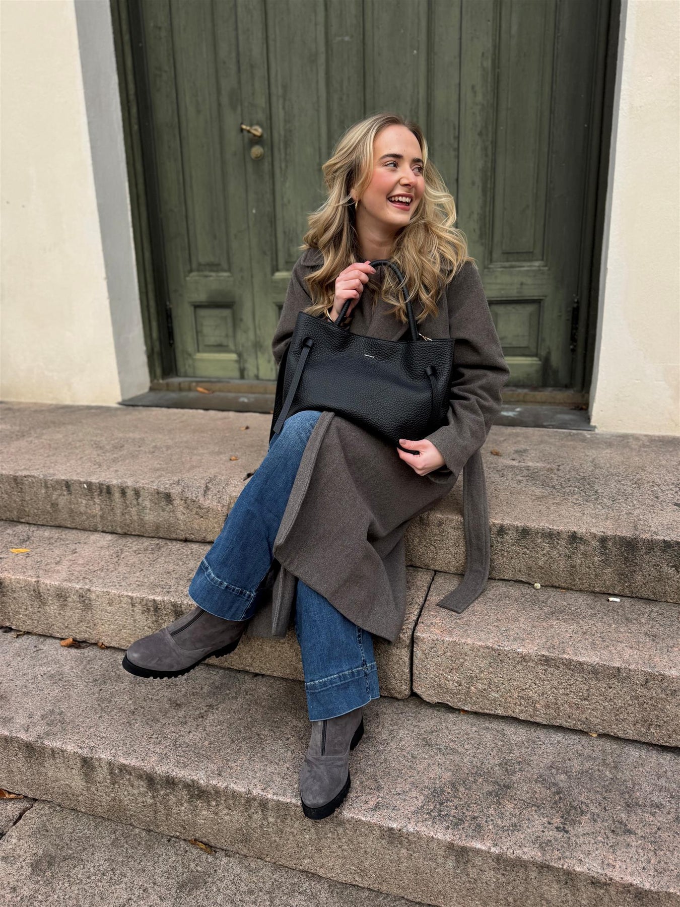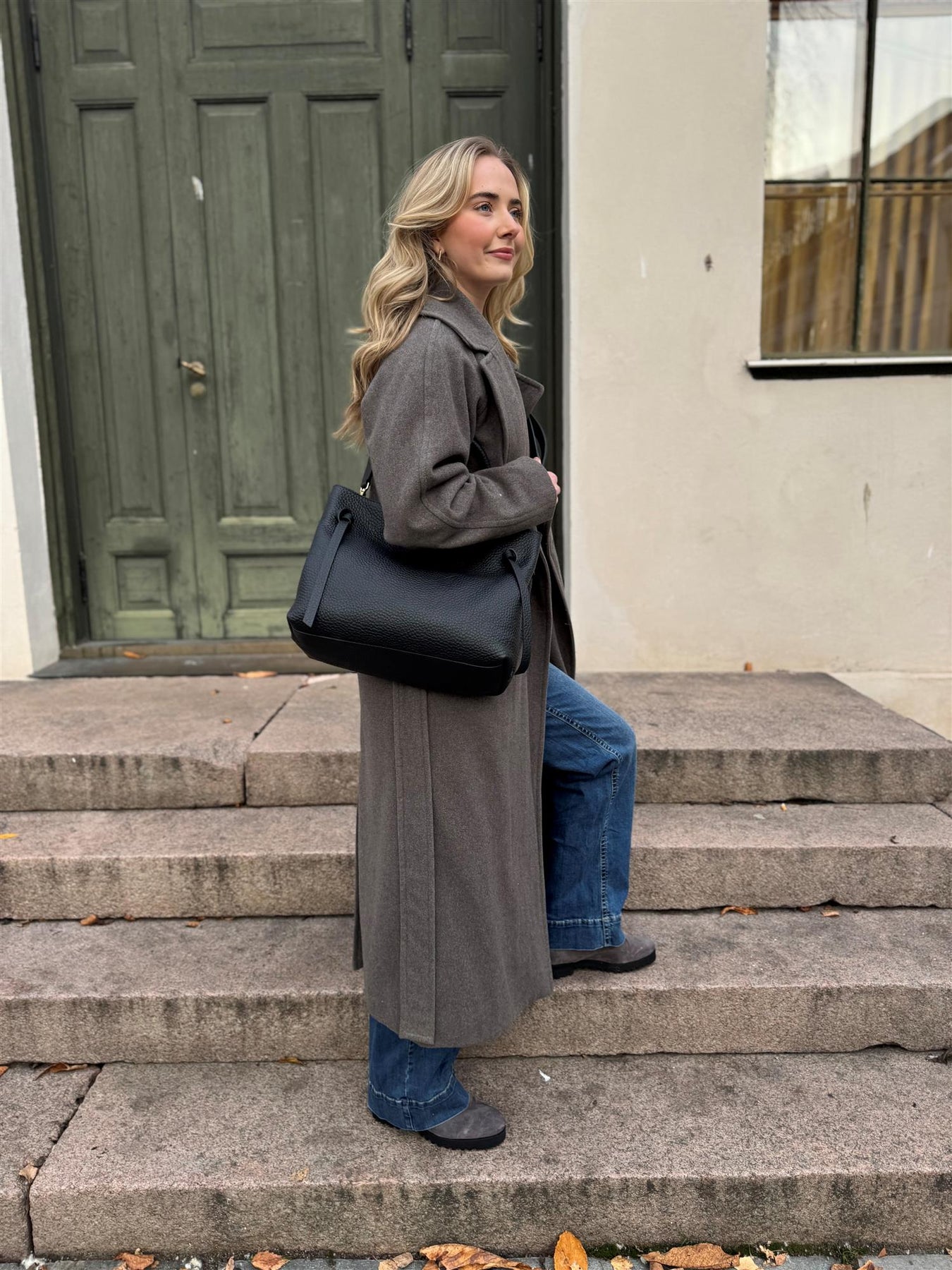 Elegant veske i mykt, strukturert kalveskinn med diskrete knutedetaljer i siden. Modellen har ett håndtak og en avtakbar skulderrem, slik at du enkelt kan bære den både i hånden og over skulderen. Vesken lukkes med magnetknapp og har glidelåslomme og to åpne lommer på innsiden.