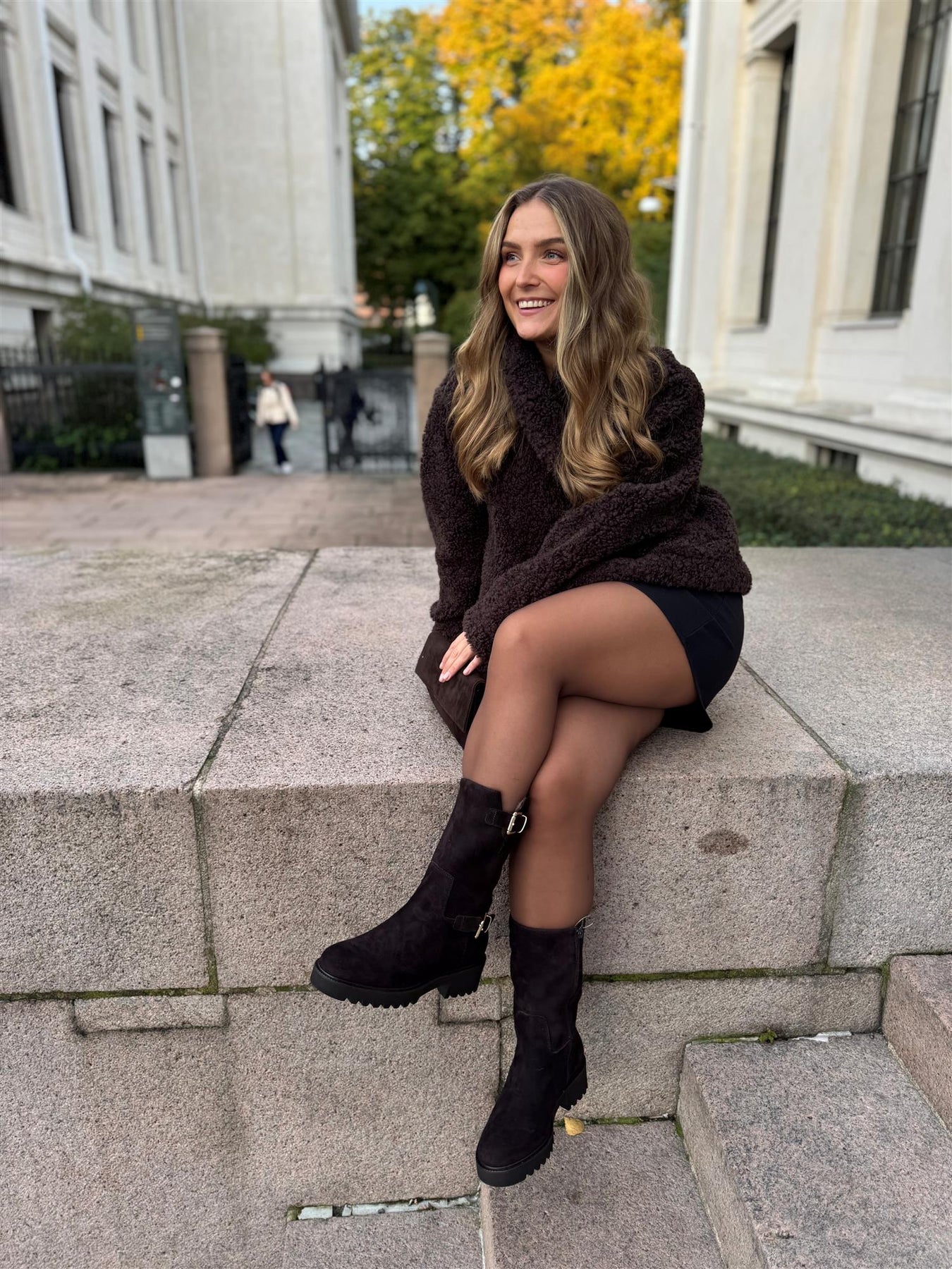 Klassisk og tidløs støvlett i semsket kalveskinn, med gullspenne-detalj i siden. Modellen har en robust gummisåle som gir godt grep på vinterføre, og er fôret med myk lammepels for ekstra varme og komfort. Den middels høye skaften og runde tåformen gir et feminint, men samtidig røft uttrykk som gjør skoen enkel å style til både bukser og skjørt.