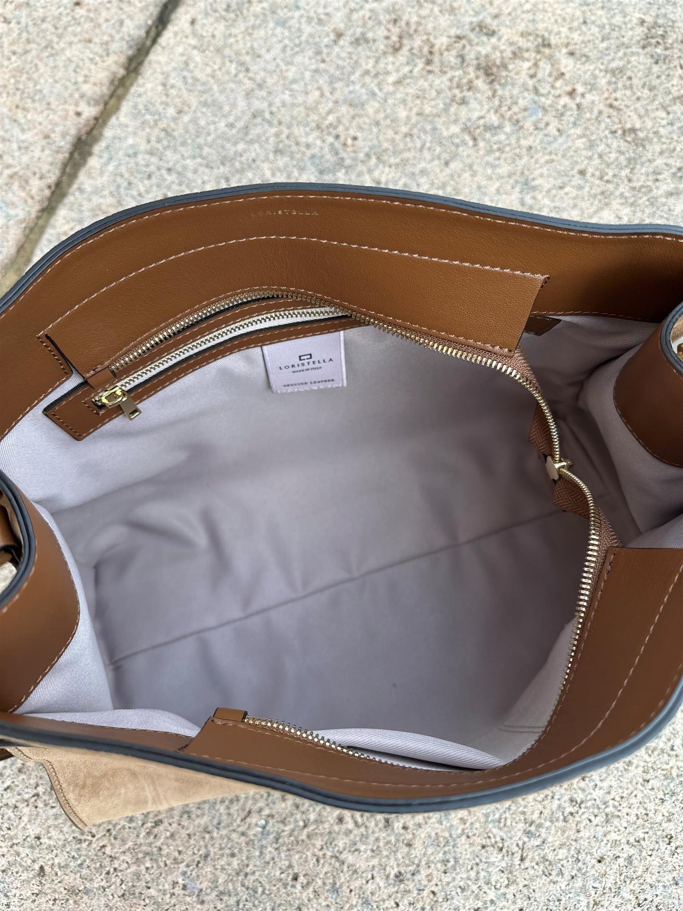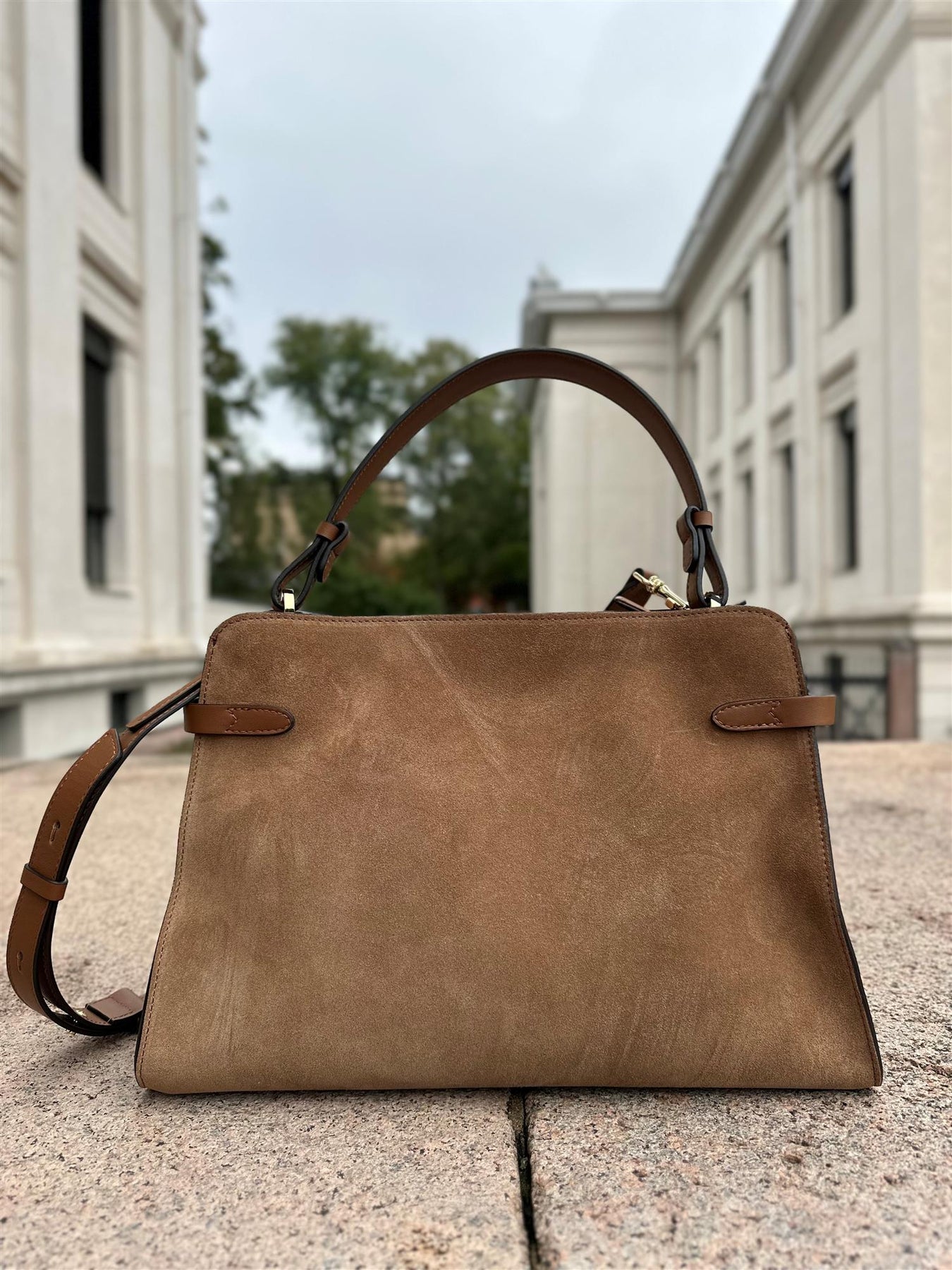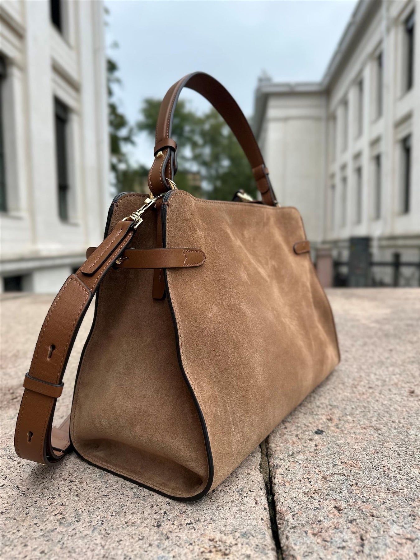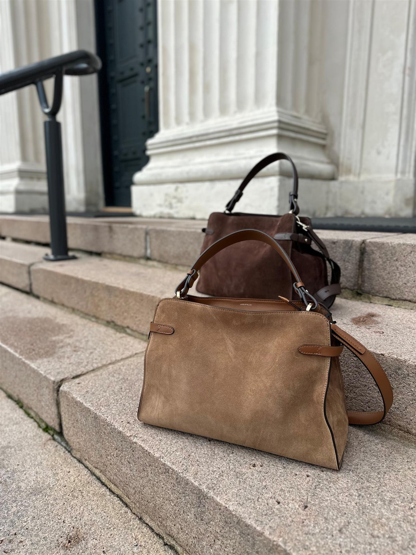 En romslig og elegant veske i mykt, semsket kalveskinn – perfekt når du ønsker både stil og funksjonalitet. Den rene silhuetten gir et sofistikert uttrykk, mens de varme nyansene i semsket skinn tilfører en lun og eksklusiv følelse.