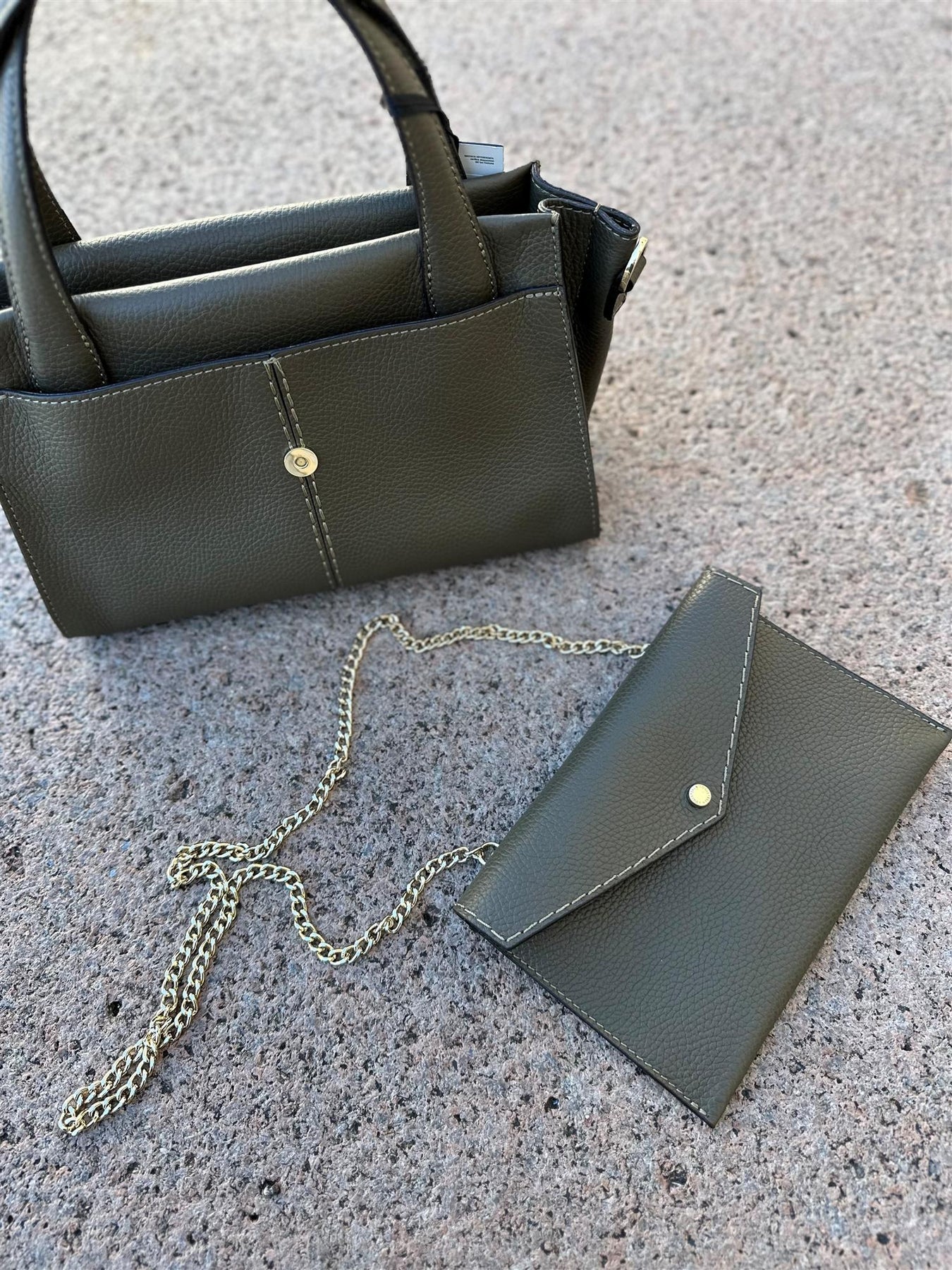 På baksiden finner du en smart konvoluttlomme som enkelt kan tas ut. Den har en fin gullkjede og kan brukes separat som en liten konvoluttveske – ideell til kveldsbruk eller når du bare vil ha med deg det viktigste.