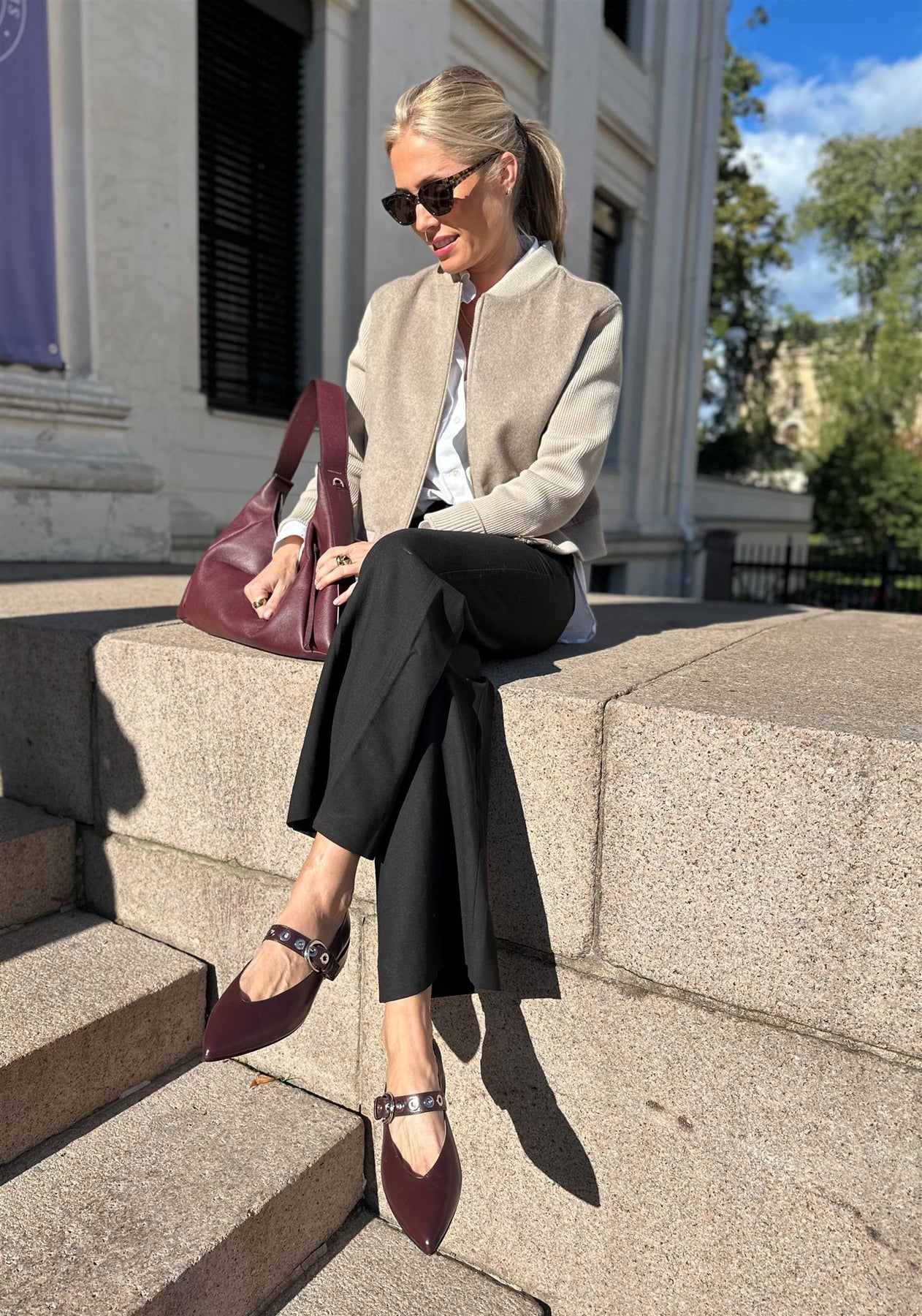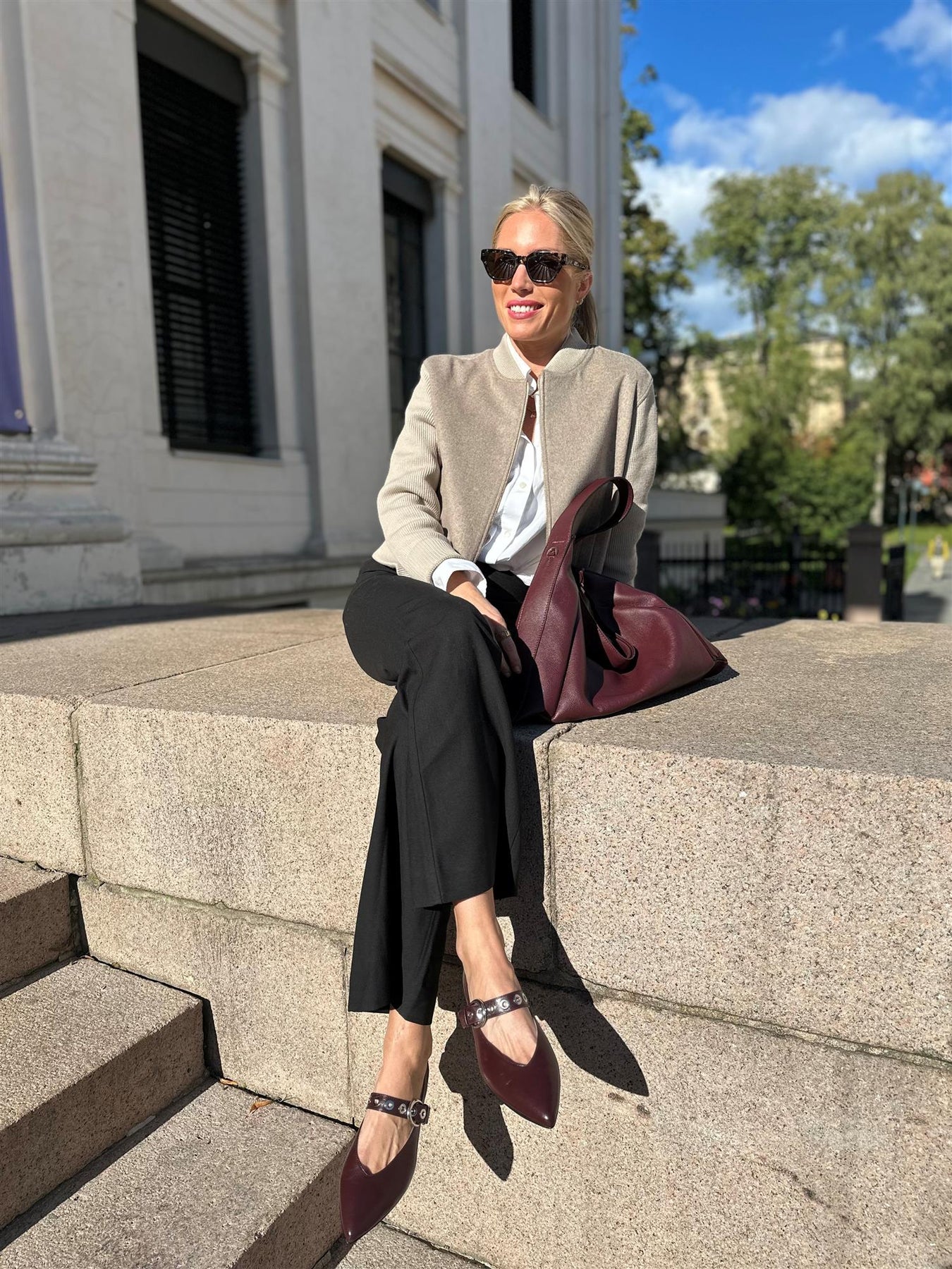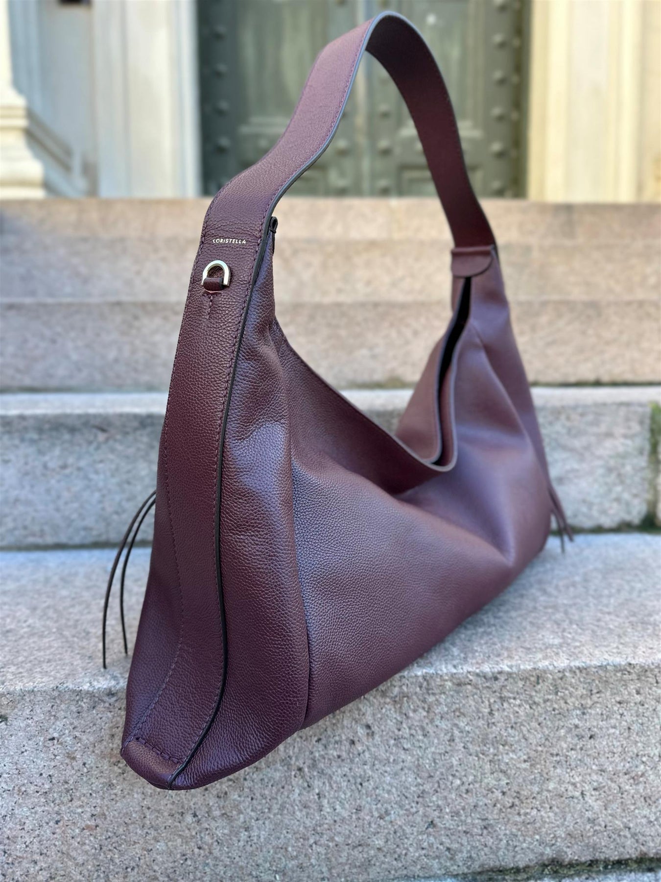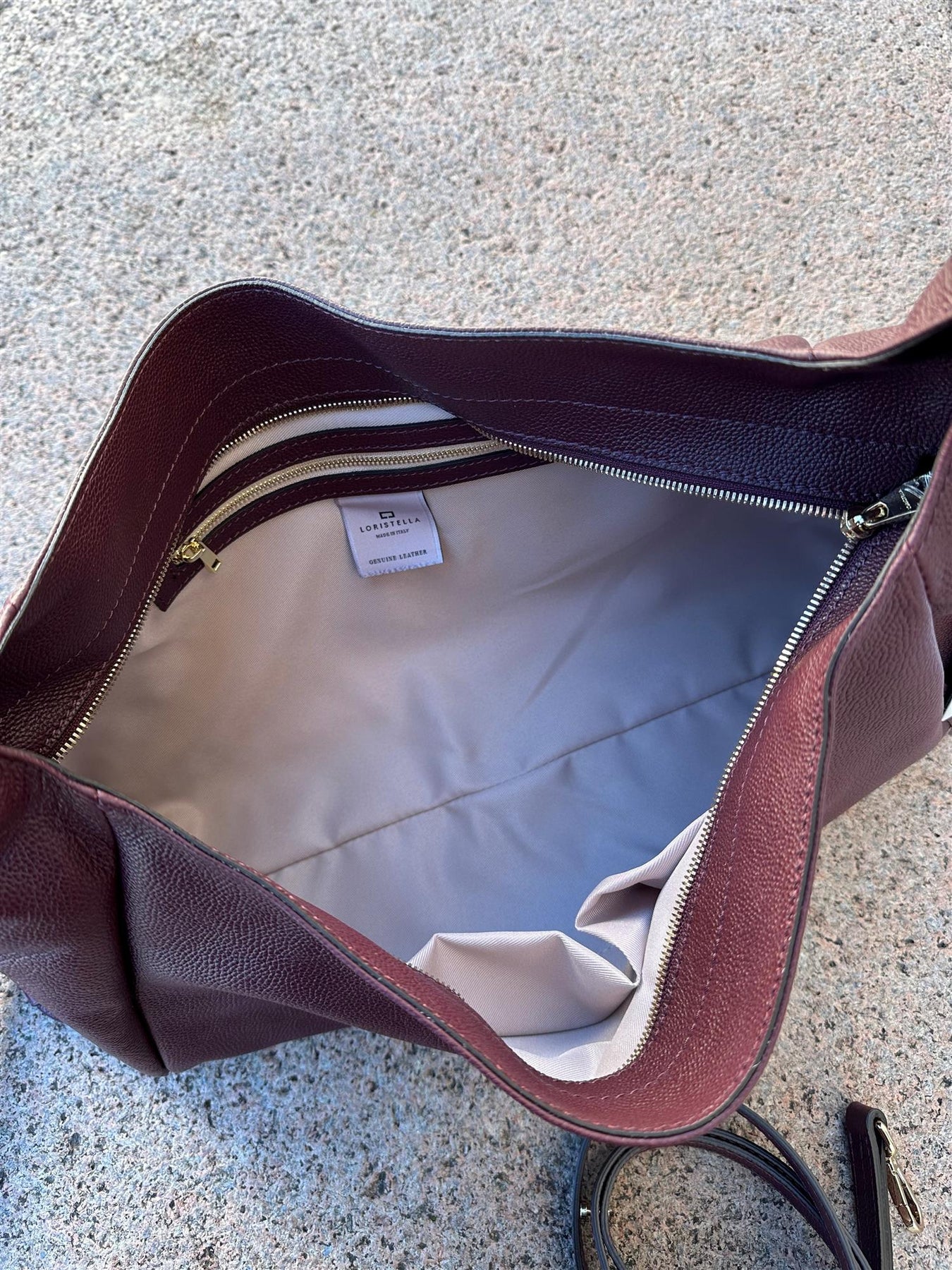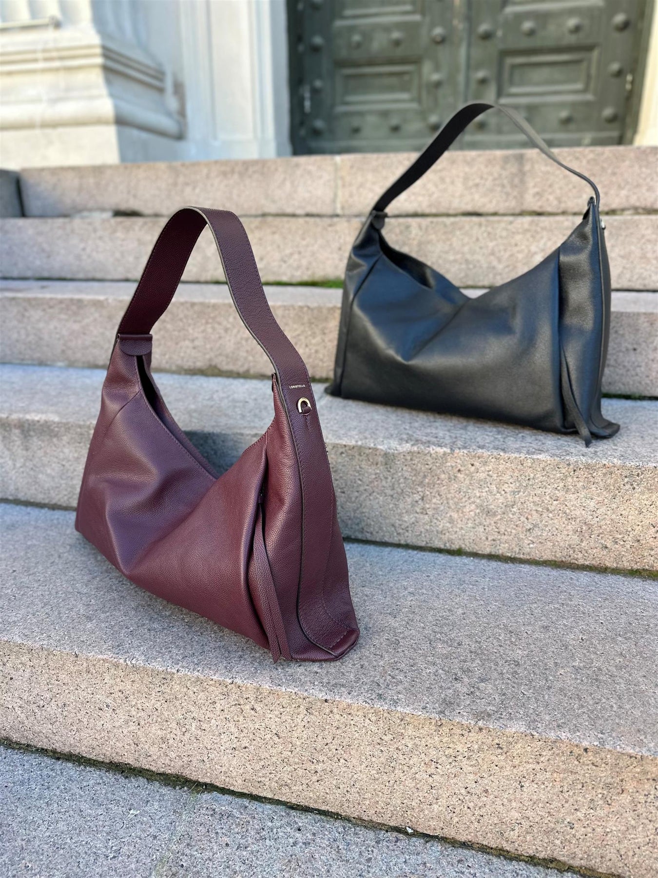 Minimalistisk og elegant skulderveske i mykt kalveskinn med ren, geometrisk fasong. Den brede skulderremmen gjør den behagelig å bære, mens innsiden byr på glidelåslomme og åpne lommer for enkel organisering. Vesken lukkes sikkert med glidelås og har en fleksibel konstruksjon som gjør den både romslig og lett å bruke til hverdags.