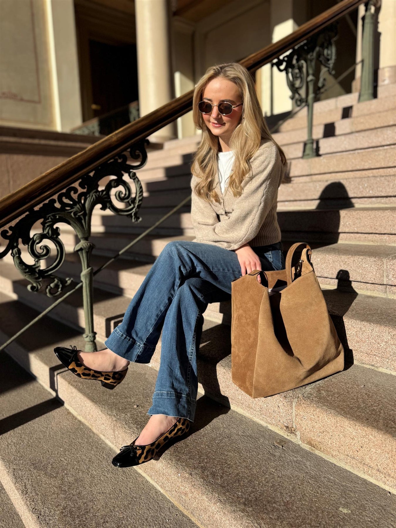 Ballerina i mykt semsket kalveskinn med klassisk leopardmønster. Den lakkerte tåkappen i sort gir en fin kontrast, og den lille sløyfen foran tilfører en enkel, feminin detalj. En tidløs modell som passer like godt til hverdagsbruk som til litt penere antrekk.
