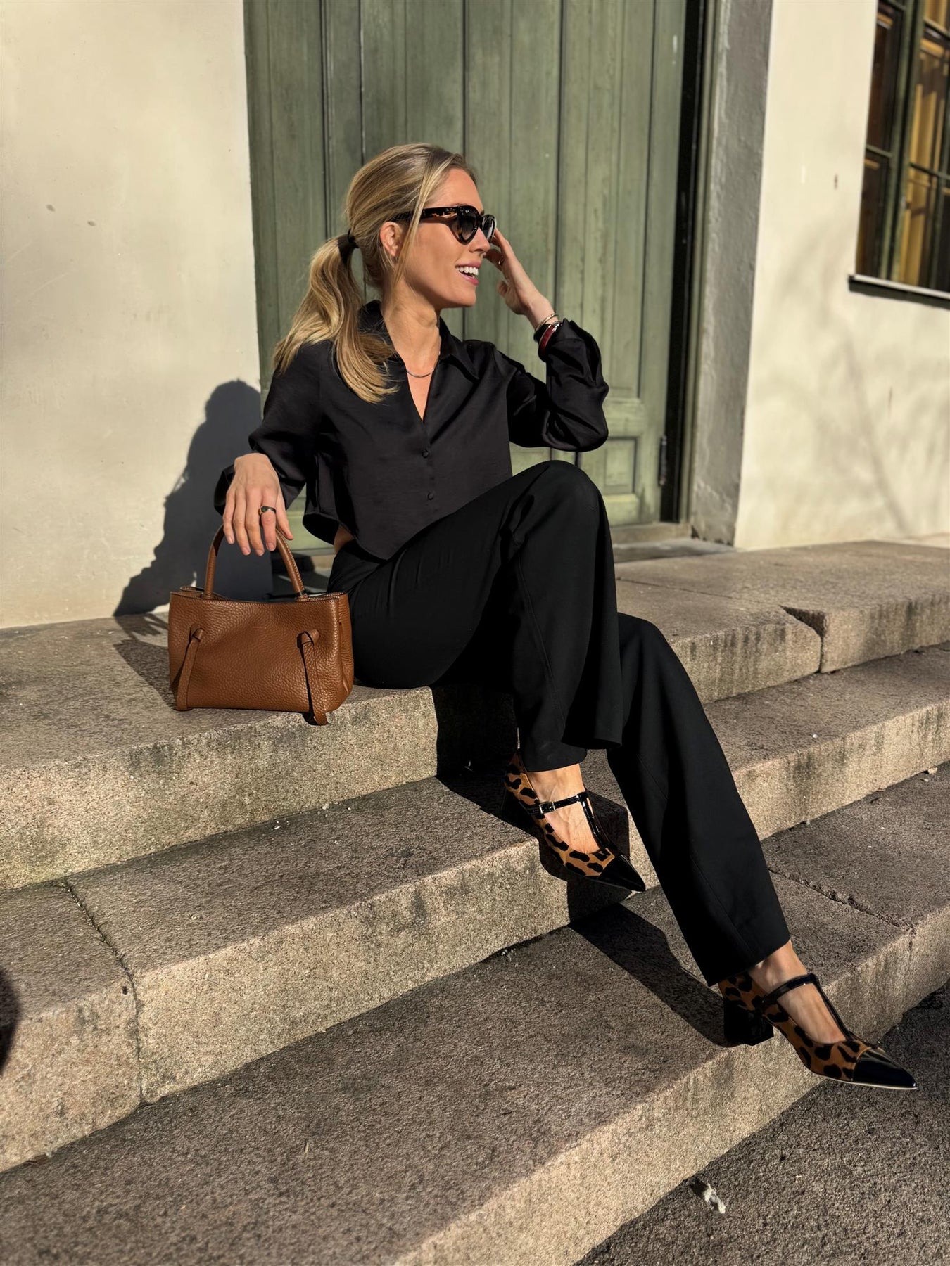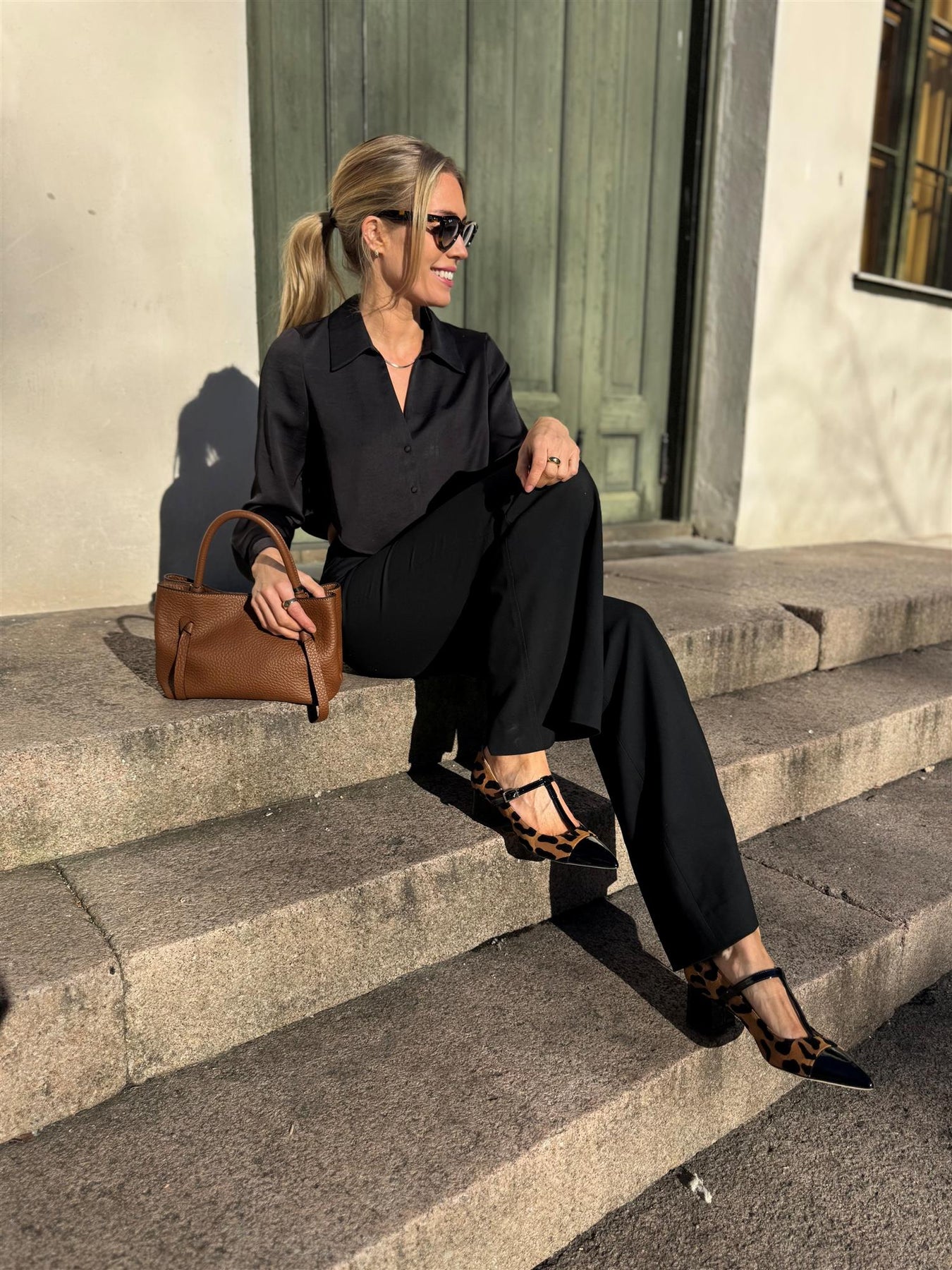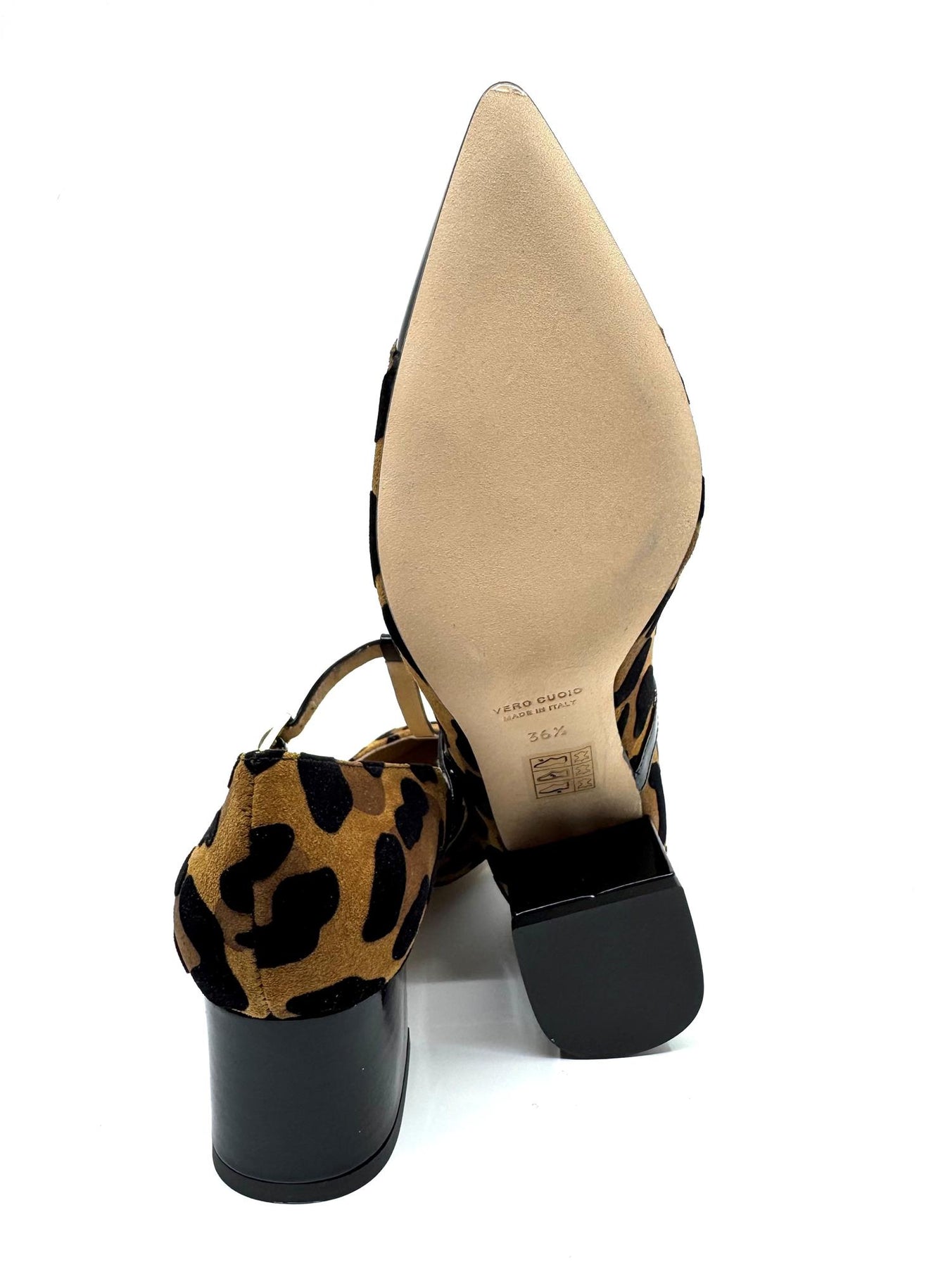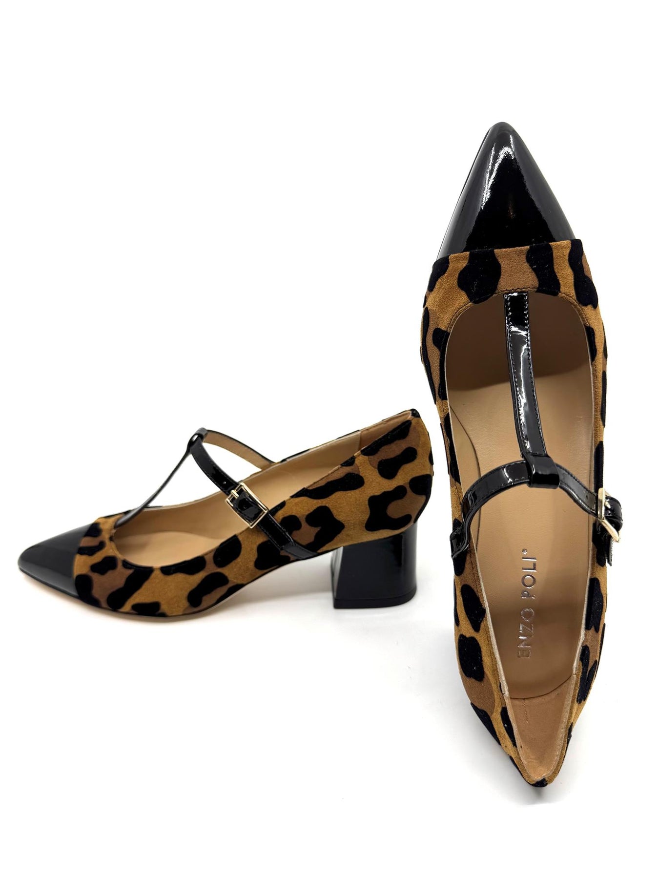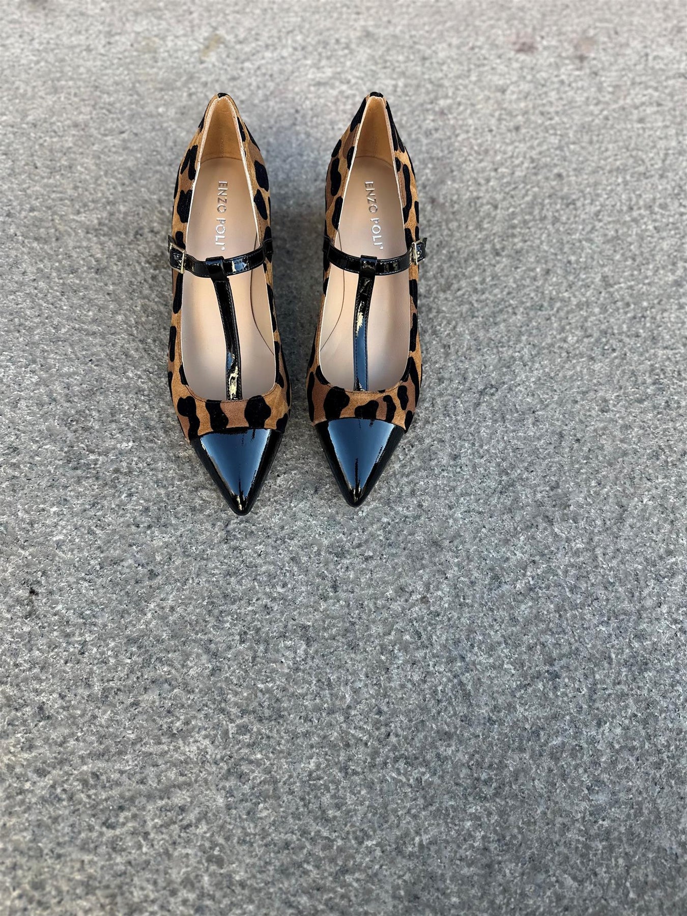 Pumps i mykt semsket kalveskinn med klassisk leopardmønster. Den lakkerte tåkappen og hælen i sort gir en fin kontrast, og remen over vristen tilfører en enkel, feminin detalj. Skoen er nett og vakker på fot, med en hæl som oppleves stødig og god å ha på!